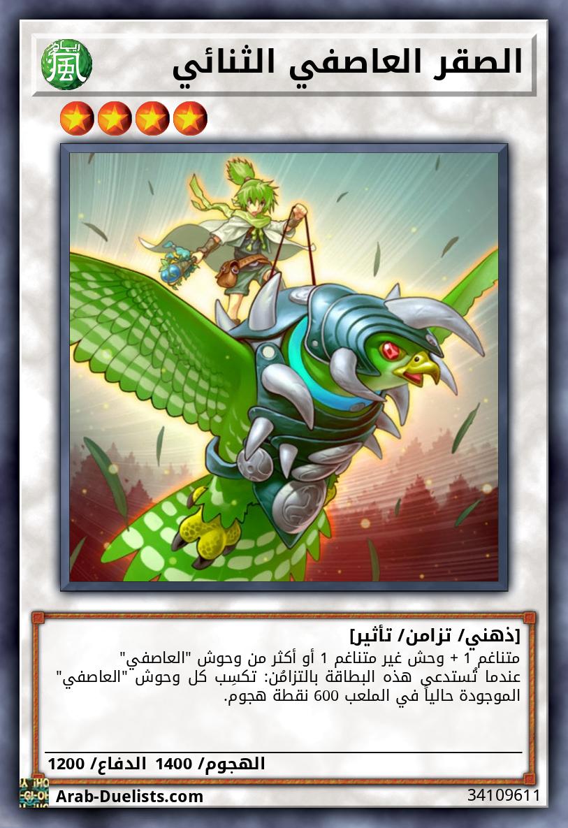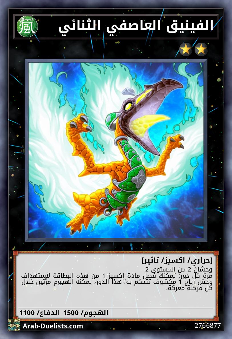 وحشان 2 من المستوى 2 مرة كل دور: يُمكنك فصل مادة إكسيز 1 من هذه البطاقة لاستهداف وحش رياح 1 مكشوف تتحكم به؛ هذا الدور، يمكنه الهجوم مرَّتين خلال كل مرحلة معركة.