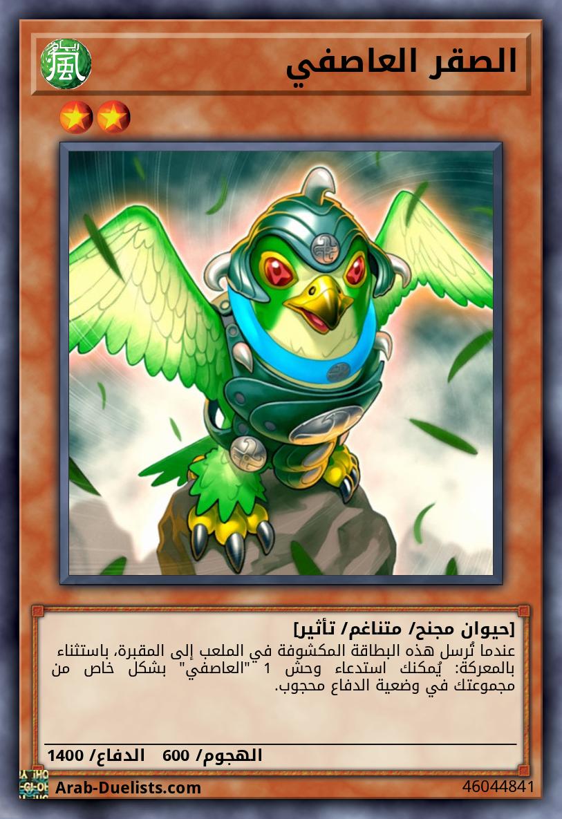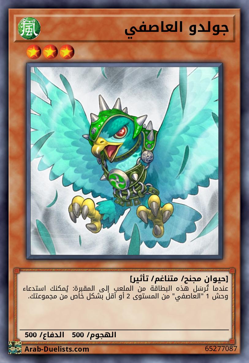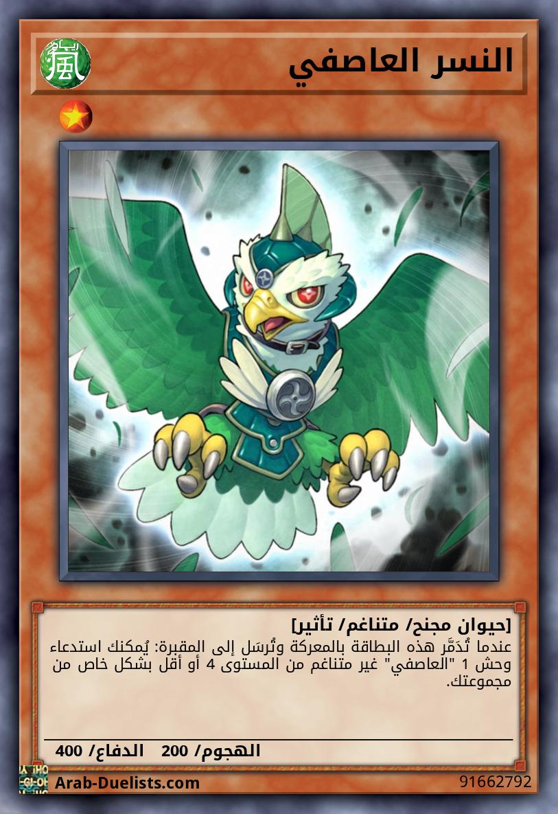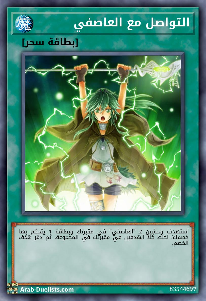 عندما تُرسل هذه البطاقة المكشوفة في الملعب إلى المقبرة، باستثناء بالمعركة: يُمكنك استدعاء وحش 1 "العاصفي" بشكل خاص من مجموعتك في وضعية الدفاع محجوب.