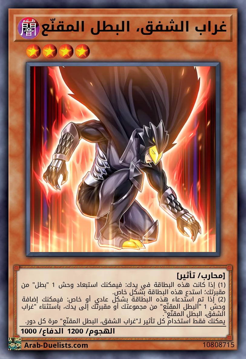 (1) إذا كانت هذه البطاقة في يدك: فيمكنك استبعاد وحش 1 "بطل" من مقبرتك؛ استدع هذه البطاقة بشكل خاص. (2) إذا تم استدعاء هذه البطاقة بشكل عادي أو خاص: فيمكنك إضافة وحش 1 "البطل المقنّع" من مجموعتك أو مقبرتك إلى يدك، باستثناء "غراب الشفق، البطل المقنّع". يمكنك فقط استخدام كل تأثير لـ"غراب الشفق، البطل المقنّع" مرة كل دور.