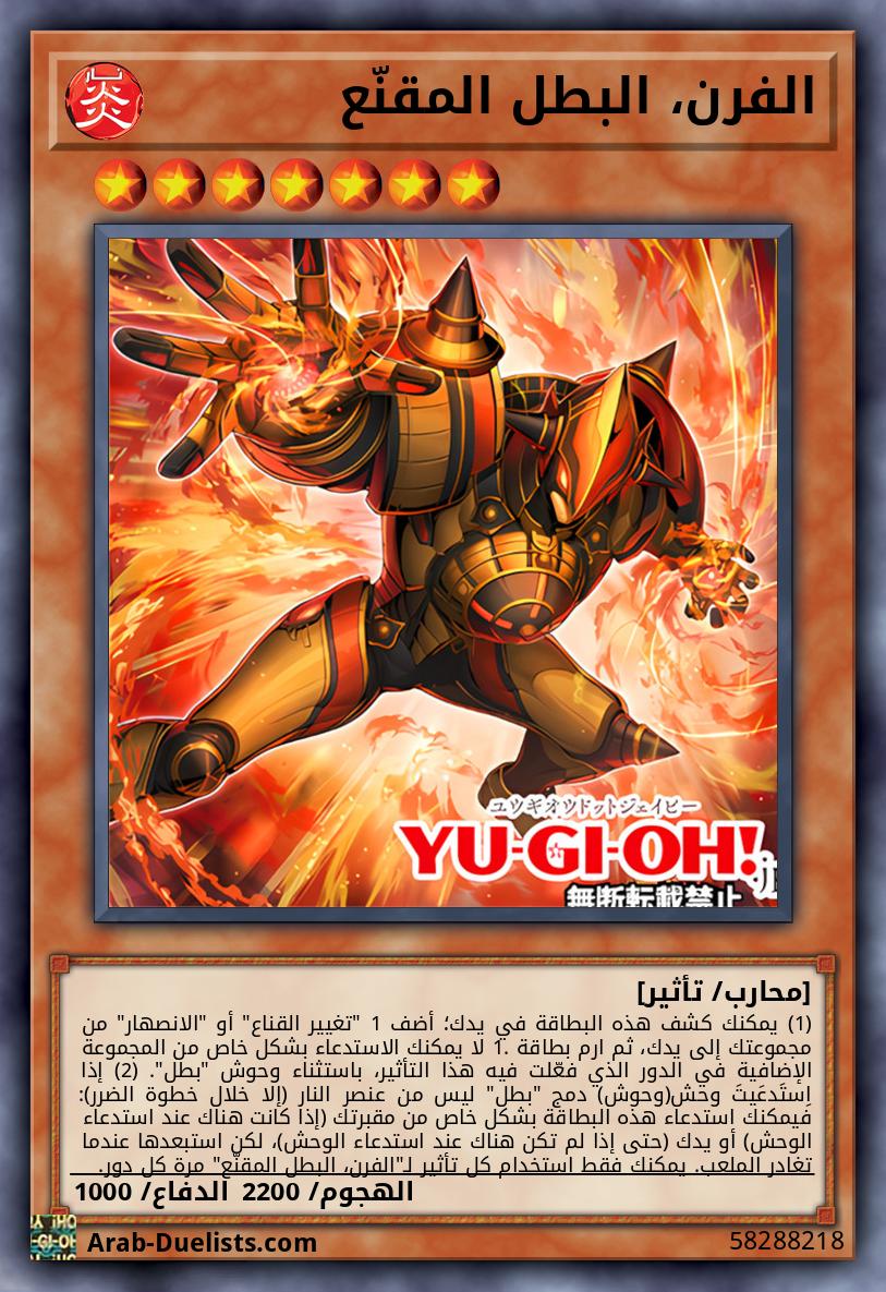 (1) يمكنك كشف هذه البطاقة في يدك؛ أضف 1 "تغيير القناع" أو "الانصهار" من مجموعتك إلى يدك، ثم ارم بطاقة 1. لا يمكنك الاستدعاء بشكل خاص من المجموعة الإضافية في الدور الذي فعّلت فيه هذا التأثير، باستثناء وحوش "بطل". (2) إذا اِستَدعَيتَ وحش(وحوش) دمج "بطل" ليس من عنصر النار (إلا خلال خطوة الضرر): فيمكنك استدعاء هذه البطاقة بشكل خاص من مقبرتك (إذا كانت هناك عند استدعاء الوحش) أو يدك (حتى إذا لم تكن هناك عند استدعاء الوحش)، لكن استبعدها عندما تغادر الملعب. يمكنك فقط استخدام كل تأثير لـ"الفرن، البطل المقنّع" مرة كل دور.