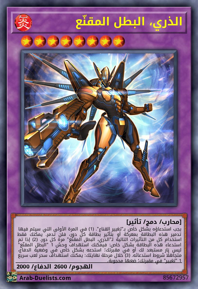 يجب استدعاؤه بشكل خاص بـ"تغيير القناع". (1) في المرة الأولى التي سيتم فيها تدمير هذه البطاقة بمعركة أو بتأثير بطاقة كل دور، فلن تدمر. يمكنك فقط استخدام كل من التأثيرات التالية لـ"الذري، البطل المقنّع" مرة كل دور. (2) إذا تم استدعاء هذه البطاقة بشكل خاص: فيمكنك استهداف وحش 1 "البطل المقنّع" ليس نار مستبعد لك أو في مقبرتك؛ استدعه بشكل خاص في وضعية الدفاع، متجاهلًا شروط استدعائه. (3) خلال مرحلة نهايتك: يمكنك استهداف سحر لعب سريع 1 "تغيير" في مقبرتك؛ ضعها محجوبة.