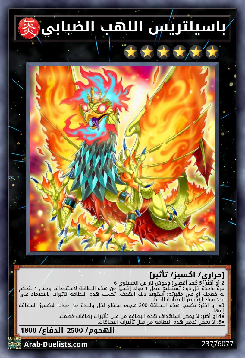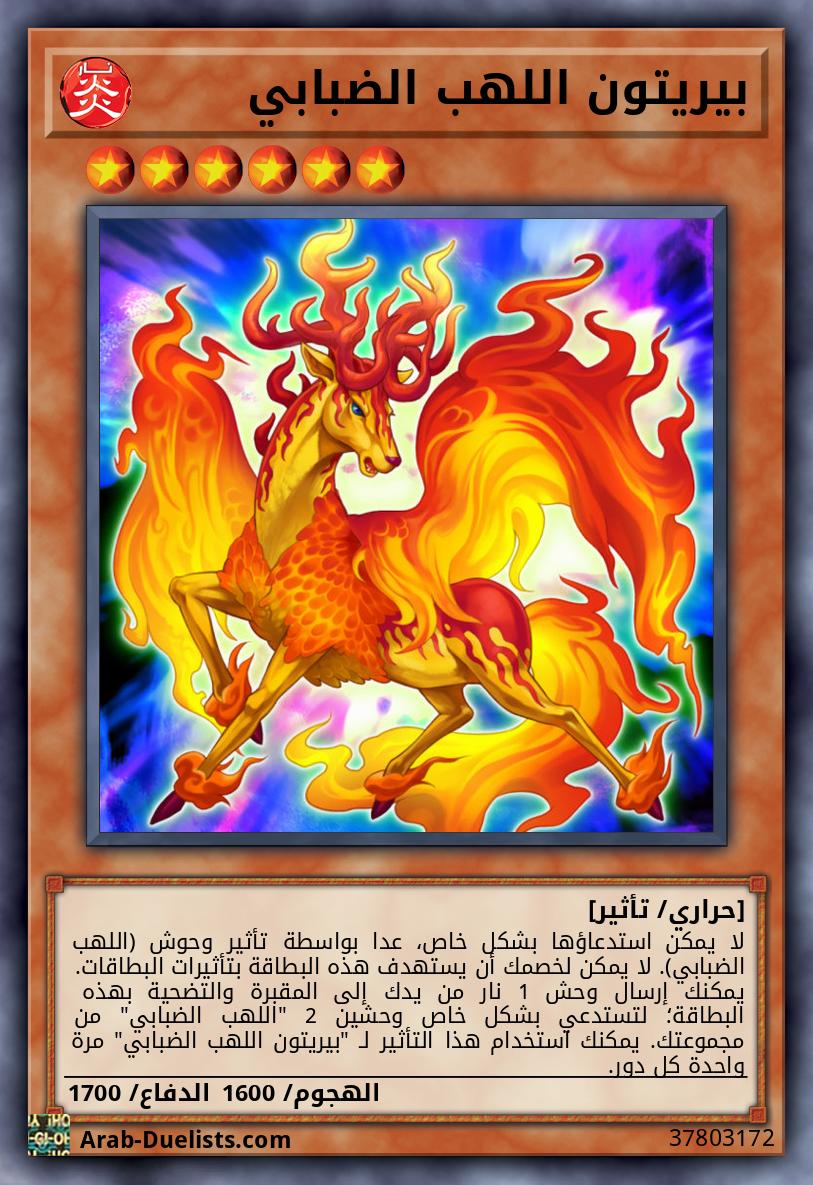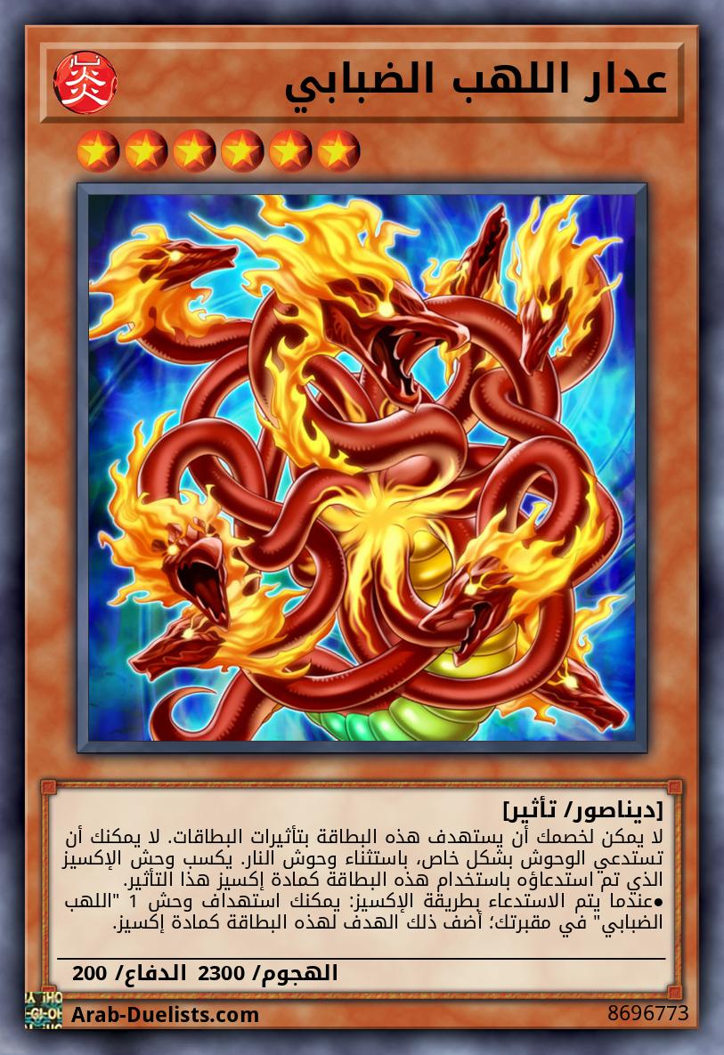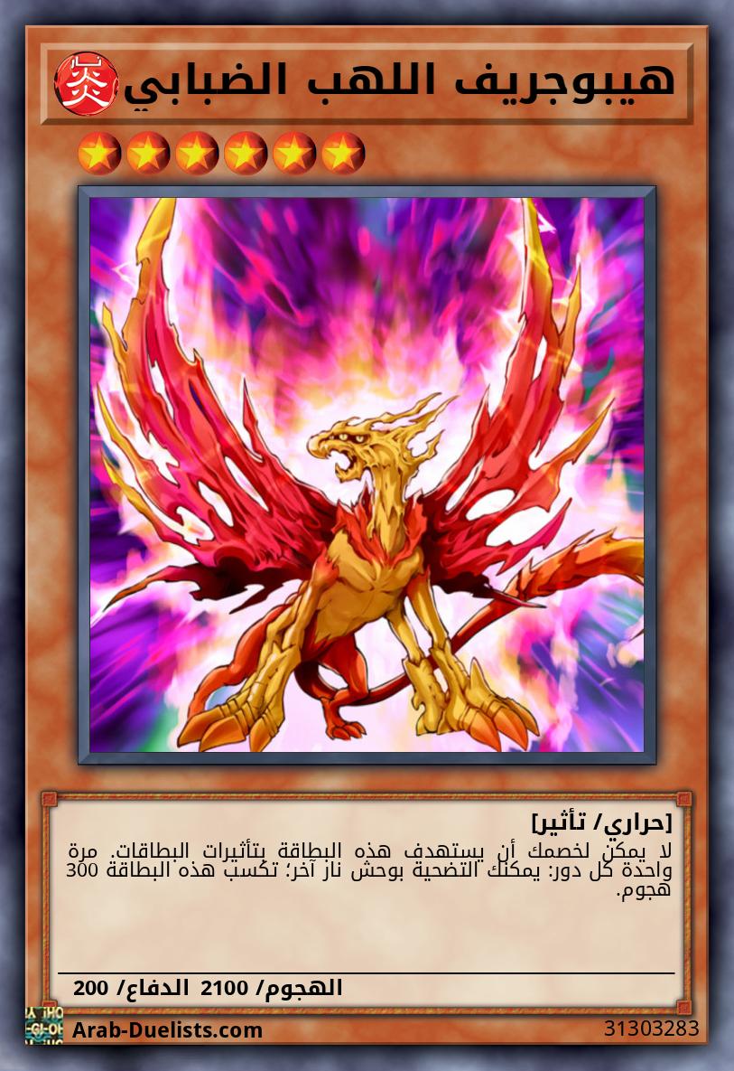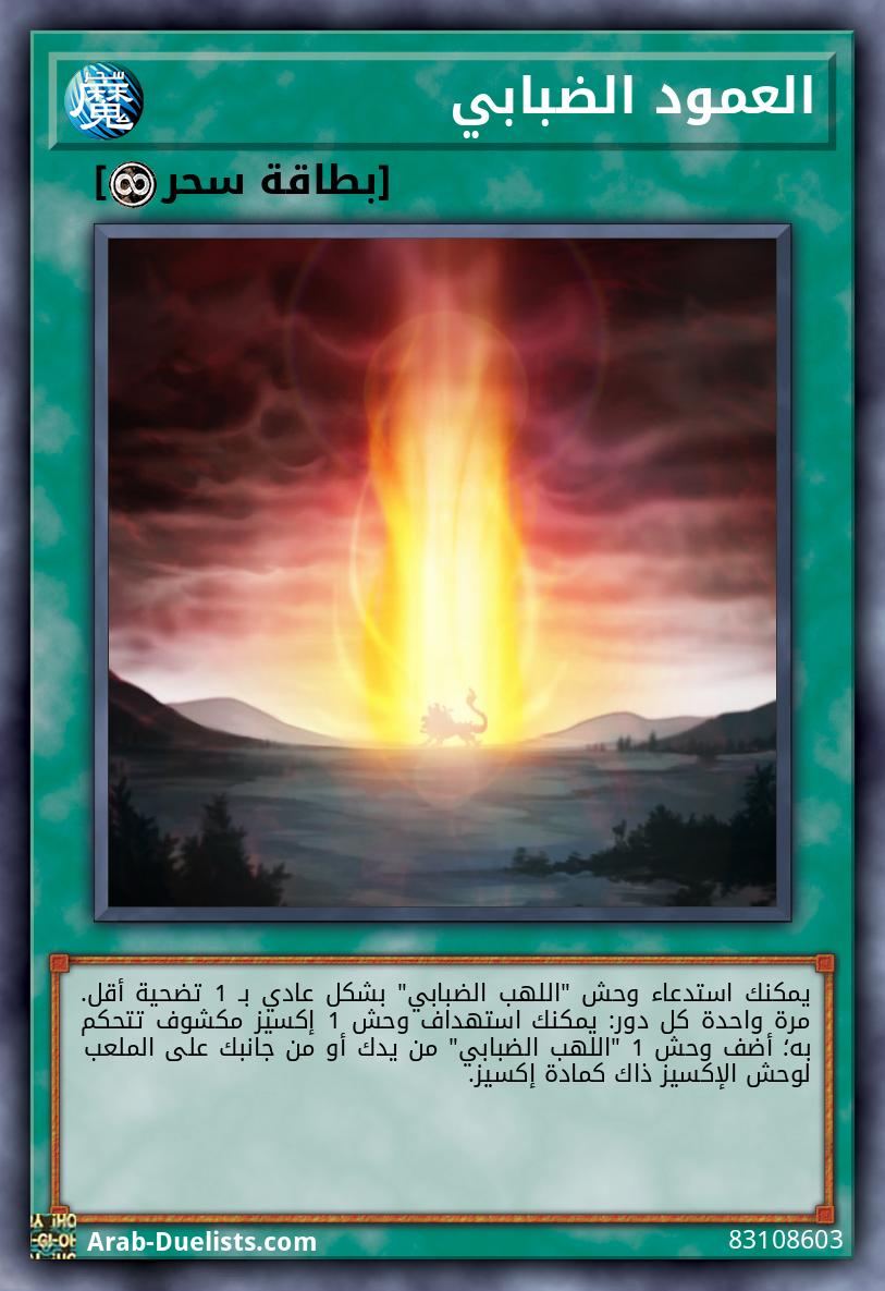 لا يمكن لخصمك أن يستهدف هذه البطاقة بتأثيرات البطاقات. لا يمكنك أن تستدعي الوحوش بشكل خاص، باستثناء وحوش النار. يكسب وحش الإكسيز الذي تم استدعاؤه باستخدام هذه البطاقة كمادة إكسيز هذا التأثير. ●عندما يتم الاستدعاء بطريقة الإكسيز: يمكنك استهداف وحش 1 "اللهب الضبابي" في مقبرتك؛ أضف ذلك الهدف لهذه البطاقة كمادة إكسيز.