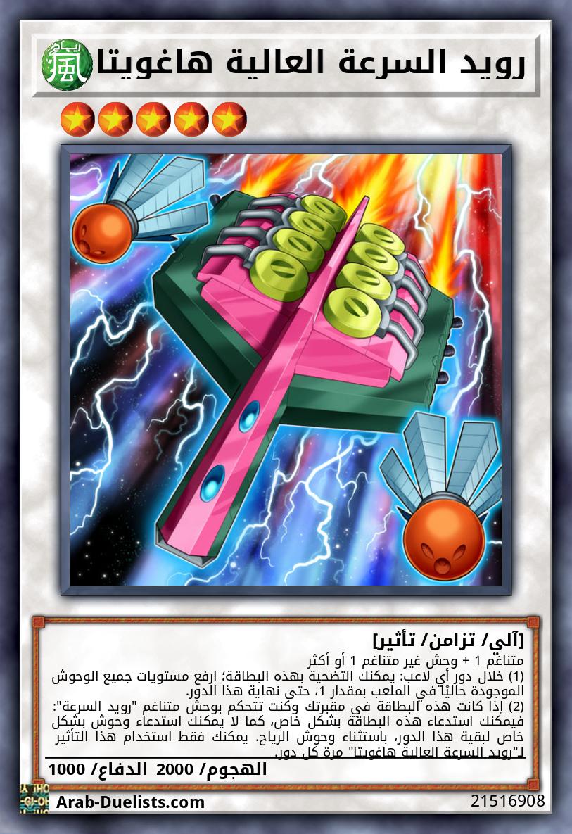 متناغم 1 + وحش غير متناغم 1 أو أكثر (1) خلال دور أي لاعب: يمكنك التضحية بهذه البطاقة؛ ارفع مستويات جميع الوحوش الموجودة حاليًا في الملعب بمقدار 1، حتى نهاية هذا الدور. (2) إذا كانت هذه البطاقة في مقبرتك وكنت تتحكم بوحش متناغم "رويد السرعة": فيمكنك استدعاء هذه البطاقة بشكل خاص، كما لا يمكنك استدعاء وحوش بشكل خاص لبقية هذا الدور، باستثناء وحوش الرياح. يمكنك فقط استخدام هذا التأثير لـ"رويد السرعة العالية هاغويتا" مرة كل دور.
