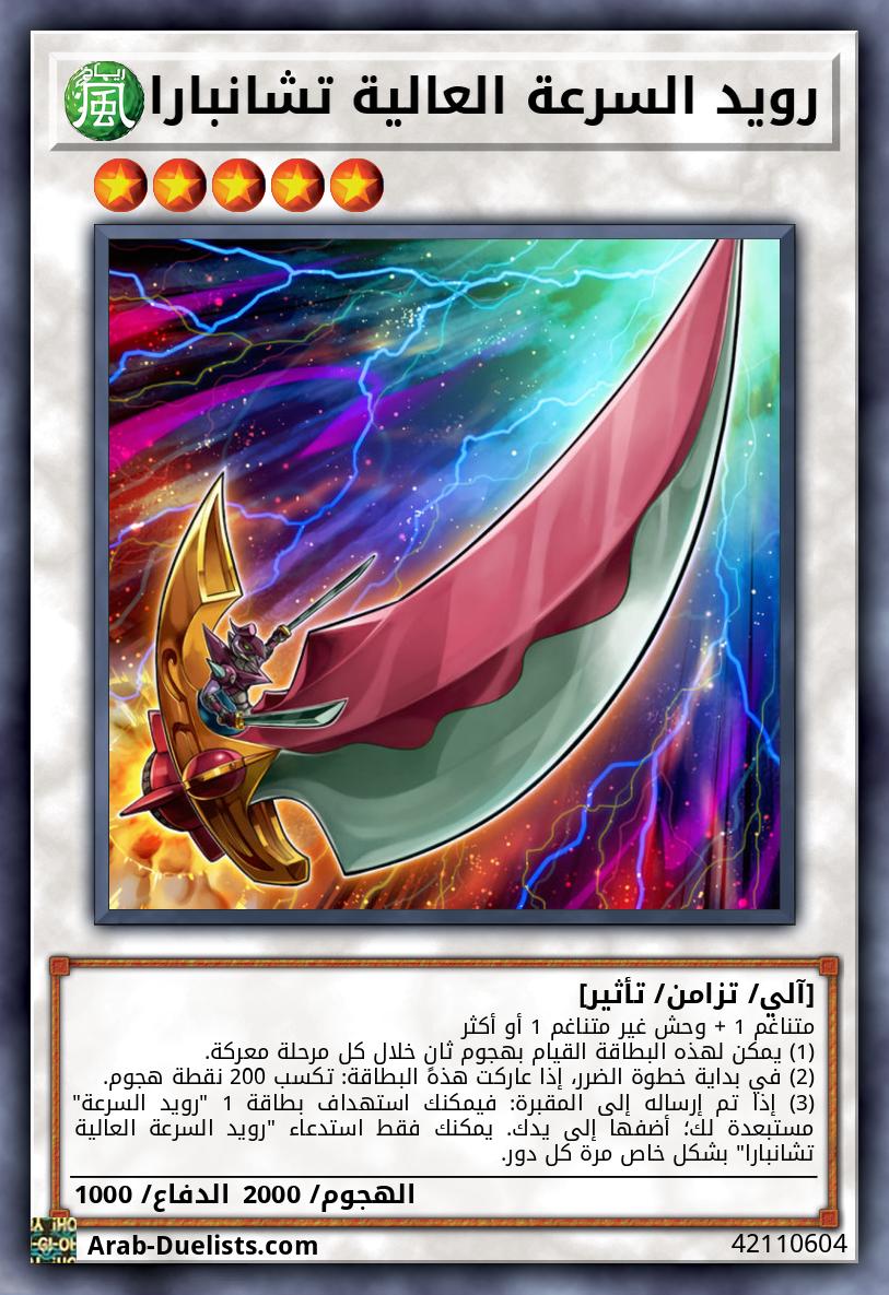 متناغم 1 + وحش غير متناغم 1 أو أكثر (1) يمكن لهذه البطاقة القيام بهجوم ثانٍ خلال كل مرحلة معركة. (2) في بداية خطوة الضرر، إذا عاركت هذه البطاقة: تكسب 200 نقطة هجوم. (3) إذا تم إرساله إلى المقبرة: فيمكنك استهداف بطاقة 1 "رويد السرعة" مستبعدة لك؛ أضفها إلى يدك. يمكنك فقط استدعاء "رويد السرعة العالية تشانبارا" بشكل خاص مرة كل دور.