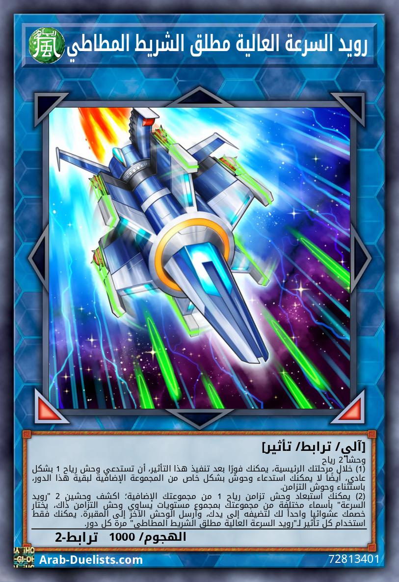 وحشا 2 رياح (1) خلال مرحلتك الرئيسية، يمكنك فورًا بعد تنفيذ هذا التأثير، أن تستدعي وحش رياح 1 بشكل عادي، أيضًا لا يمكنك استدعاء وحوش بشكل خاص من المجموعة الإضافية لبقية هذا الدور، باستثناء وحوش التزامن. (2) يمكنك استبعاد وحش تزامن رياح 1 من مجموعتك الإضافية؛ اكشف وحشين 2 "رويد السرعة" بأسماء مختلفة من مجموعتك بمجموع مستويات يساوي وحش التزامن ذاك، يختار خصمك عشوائيا واحداً لك لتضيفه إلى يدك، وأرسل الوحش الآخر إلى المقبرة. يمكنك فقط استخدام كل تأثير لـ"رويد السرعة العالية مطلق الشريط المطاطي" مرة كل دور.