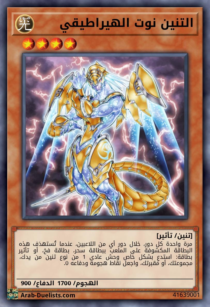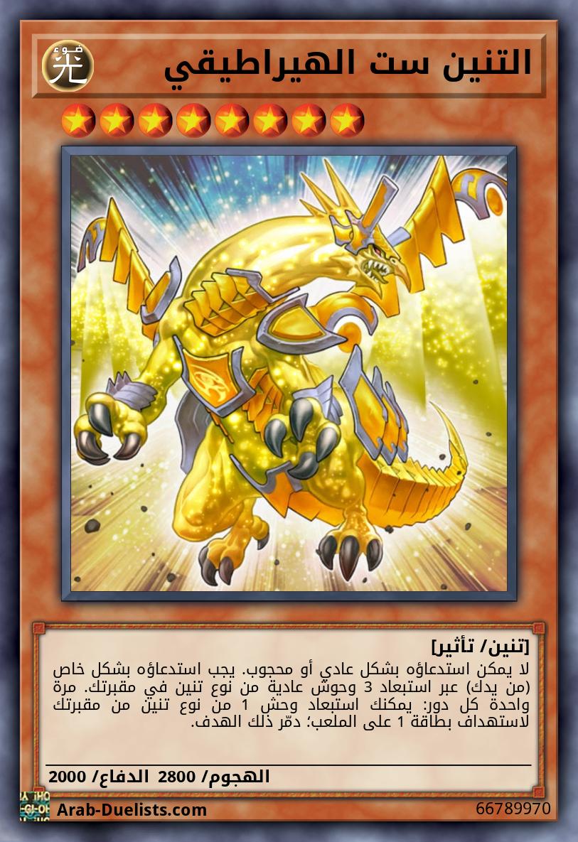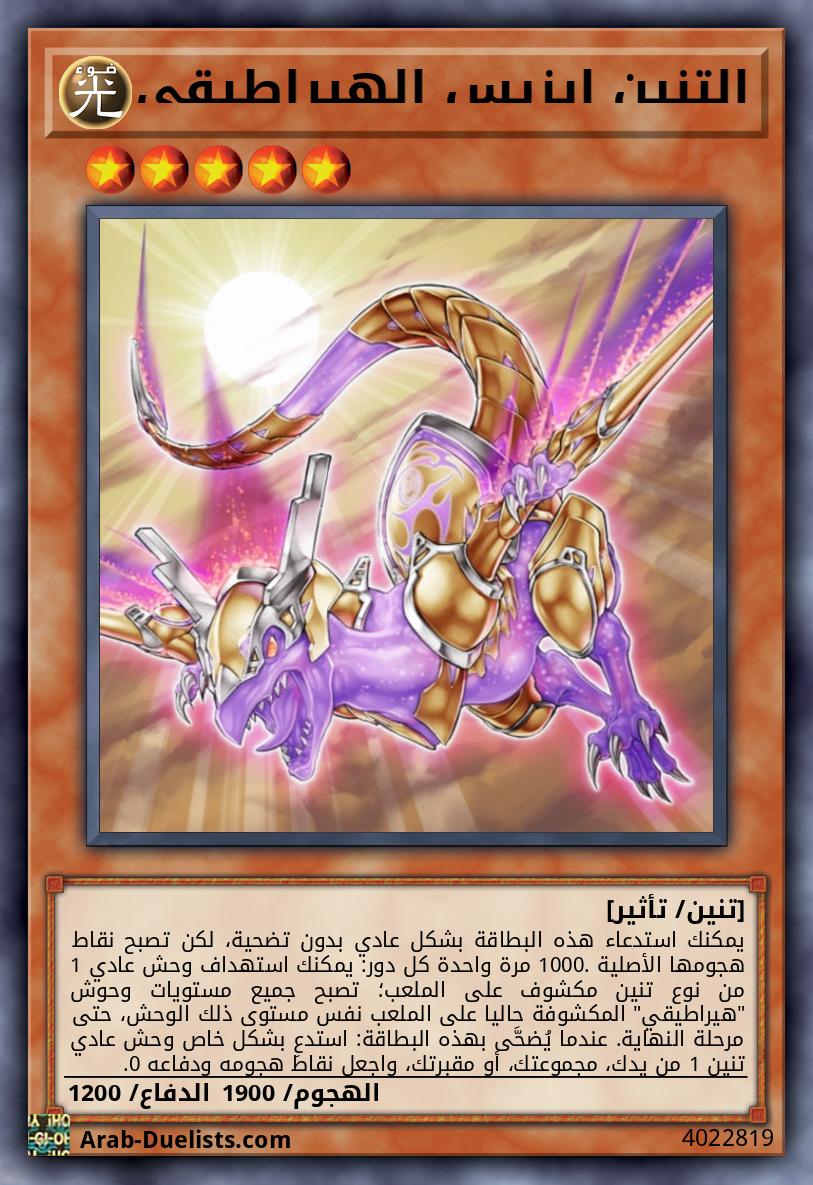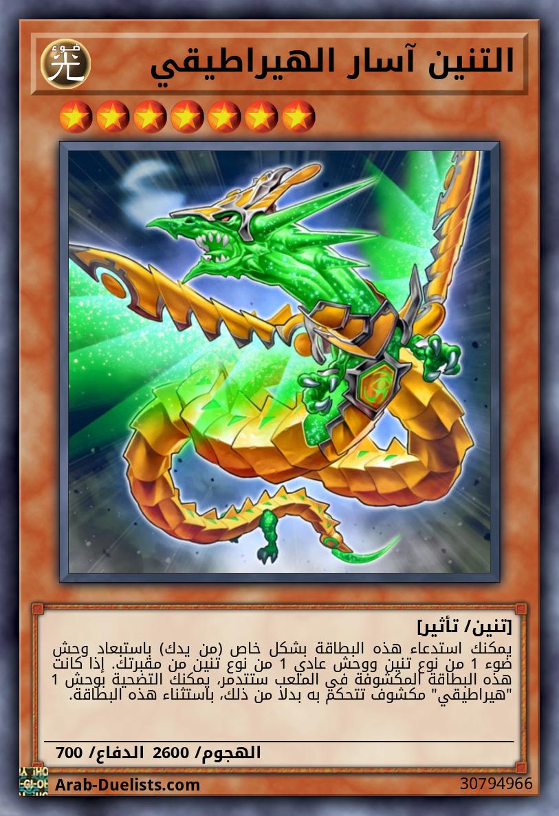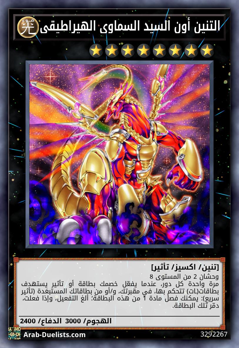 يمكنك استدعاء هذه البطاقة بشكل عادي بدون تضحية، لكن تصبح نقاط هجومها الأصلية 1000. مرة واحدة كل دور: يمكنك استهداف وحش عادي 1 من نوع تنين مكشوف على الملعب؛ تصبح جميع مستويات وحوش "هيراطيقي" المكشوفة حاليا على الملعب نفس مستوى ذلك الوحش، حتى مرحلة النهاية. عندما يُضحَّى بهذه البطاقة: استدعِ بشكل خاص وحش عادي تنين 1 من يدك، مجموعتك، أو مقبرتك، واجعل نقاط هجومه ودفاعه 0.