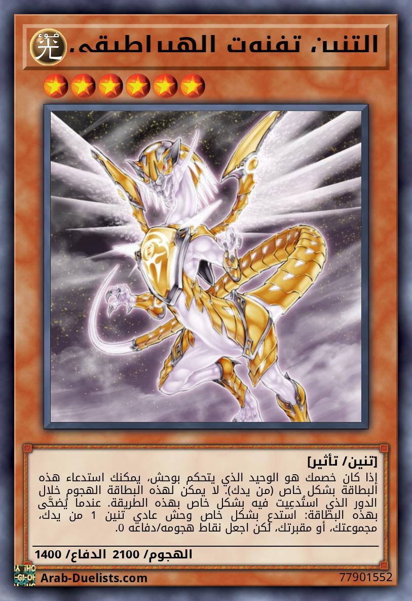 يمكنك استدعاء هذه البطاقة بشكل خاص (من يدك) باستبعاد وحش ضوء 1 من نوع تنين ووحش عادي 1 من نوع تنين من مقبرتك. إذا كانت هذه البطاقة المكشوفة في الملعب ستتدمر، يمكنك التضحية بوحش 1 "هيراطيقي" مكشوف تتحكم به بدلا من ذلك، باستثناء هذه البطاقة.