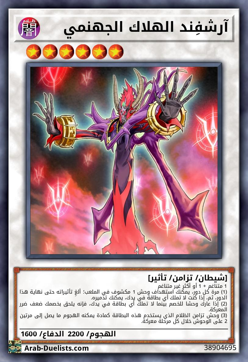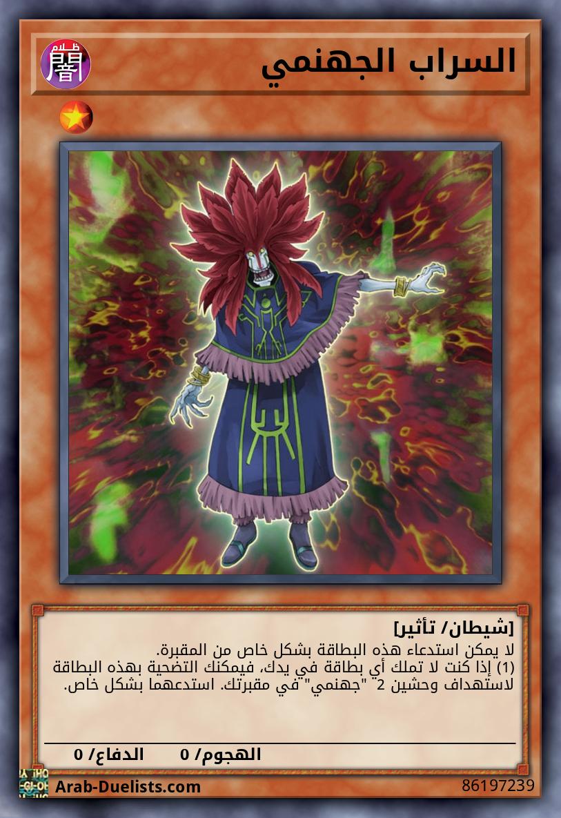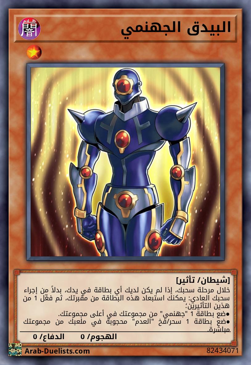فعلها فقط إذا كنت لا تملك أي بطاقة في يدك. (1) استهدف وحش 1 "جهنمي" في مقبرتك. استدعه بشكل خاص، و دمر كل الوحوش المكشوفة في الملعب التي تملك نقاط هجوم أقل من هجوم الوحش الذي تم استدعاؤه بهذا التأثير. (2) لا يمكنك خوض مرحلة معركتك في الدور الذي فعلت فيه هذه البطاقة.