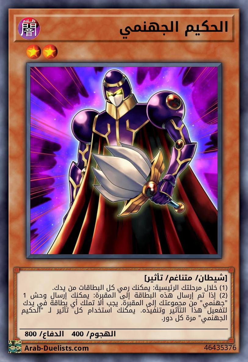 (1) خلال مرحلتك الرئيسية: يمكنك رمي كل البطاقات من يدك. (2) إذا تم إرسال هذه البطاقة إلى المقبرة: يمكنك إرسال وحش 1 "جهنمي" من مجموعتك إلى المقبرة. يجب ألا تملك أي بطاقة في يدك لتفعيل هذا التأثير وتنفيذه. يمكنك استخدام كل تأثير لـ "الحكيم الجهنمي" مرة كل دور.