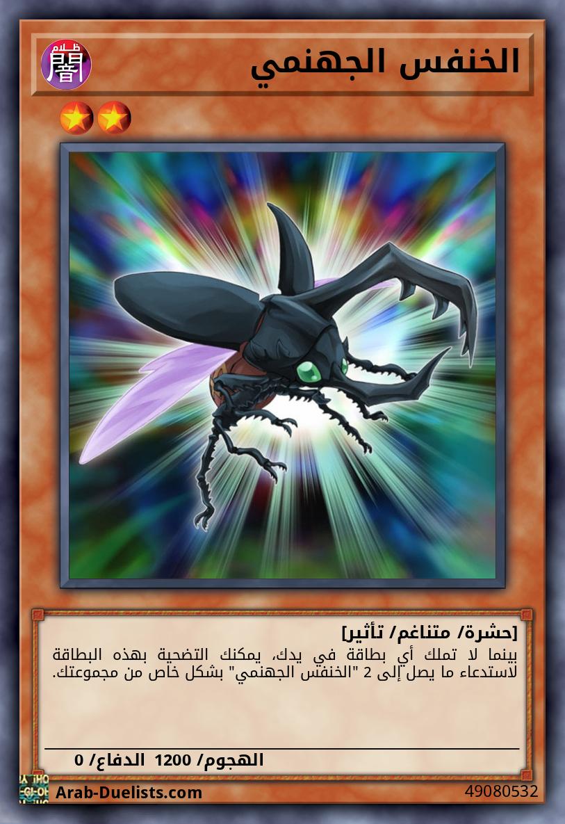 بينما لا تملك أي بطاقة في يدك، يمكنك التضحية بهذه البطاقة لاستدعاء ما يصل إلى 2 "الخنفس الجهنمي" بشكل خاص من مجموعتك.