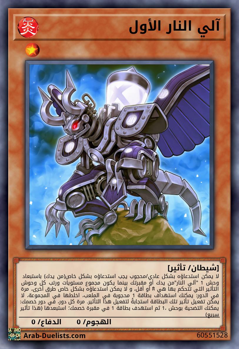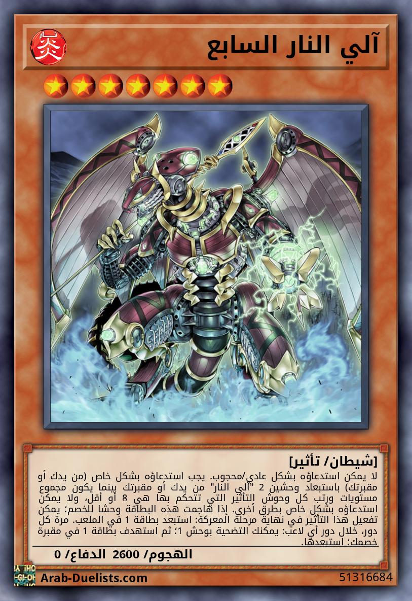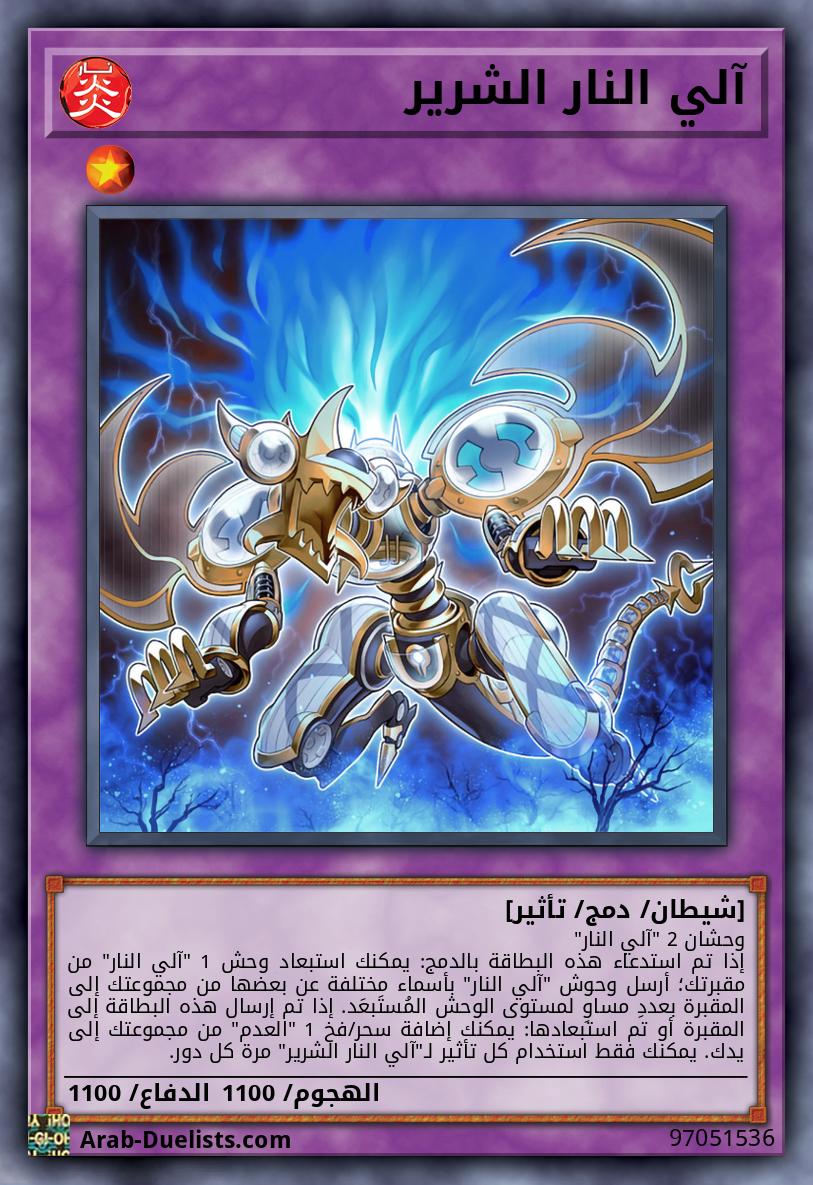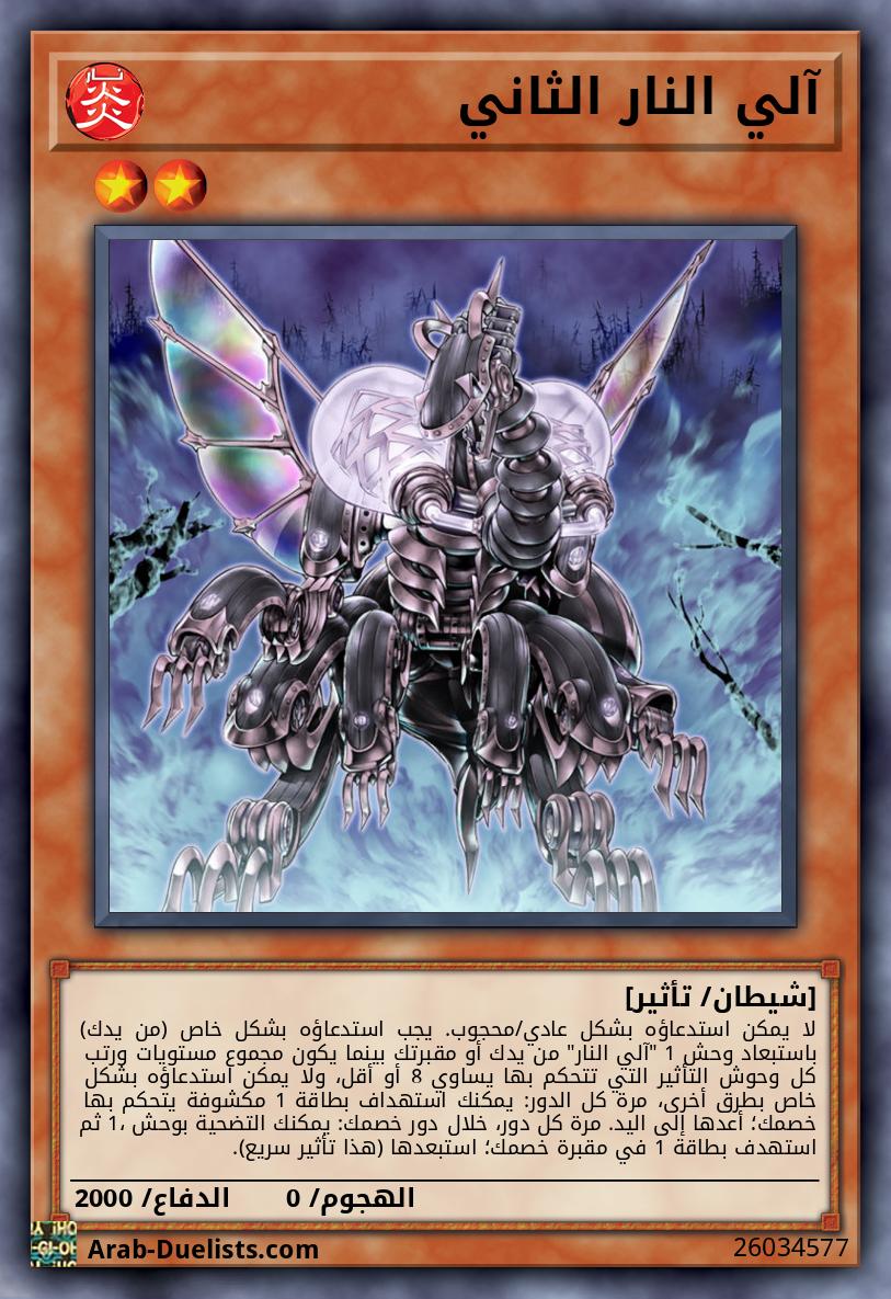 وحشان 2 "آلي النار" إذا تم استدعاء هذه البطاقة بالدمج: يمكنك استبعاد وحش 1 "آلي النار" من مقبرتك؛ أرسل وحوش "آلي النار" بأسماء مختلفة عن بعضها من مجموعتك إلى المقبرة بعددِ مساوِ لمستوى الوحش المُستَبعَد. إذا تم إرسال هذه البطاقة إلى المقبرة أو تم استبعادها: يمكنك إضافة سحر/فخ 1 "العدم" من مجموعتك إلى يدك. يمكنك فقط استخدام كل تأثير لـ"آلي النار الشرير" مرة كل دور.