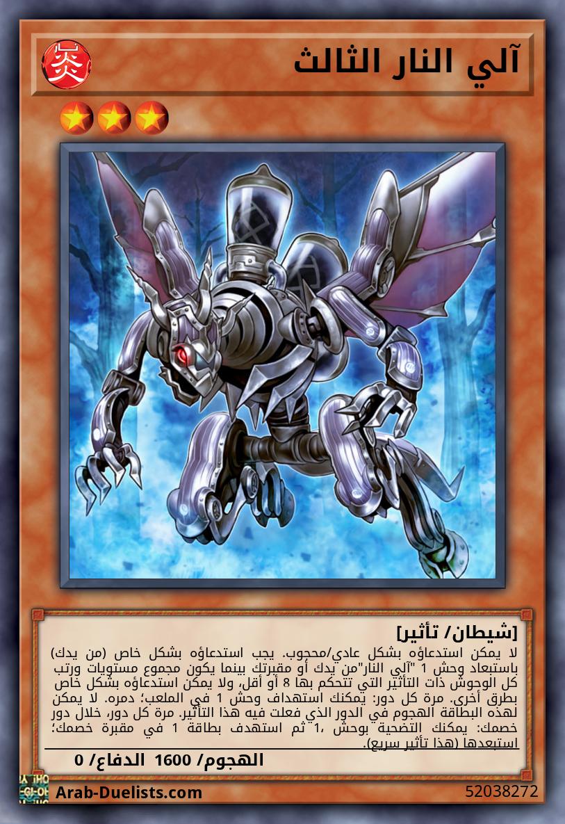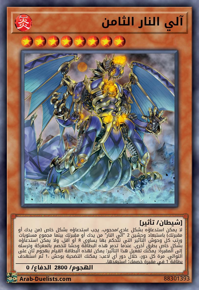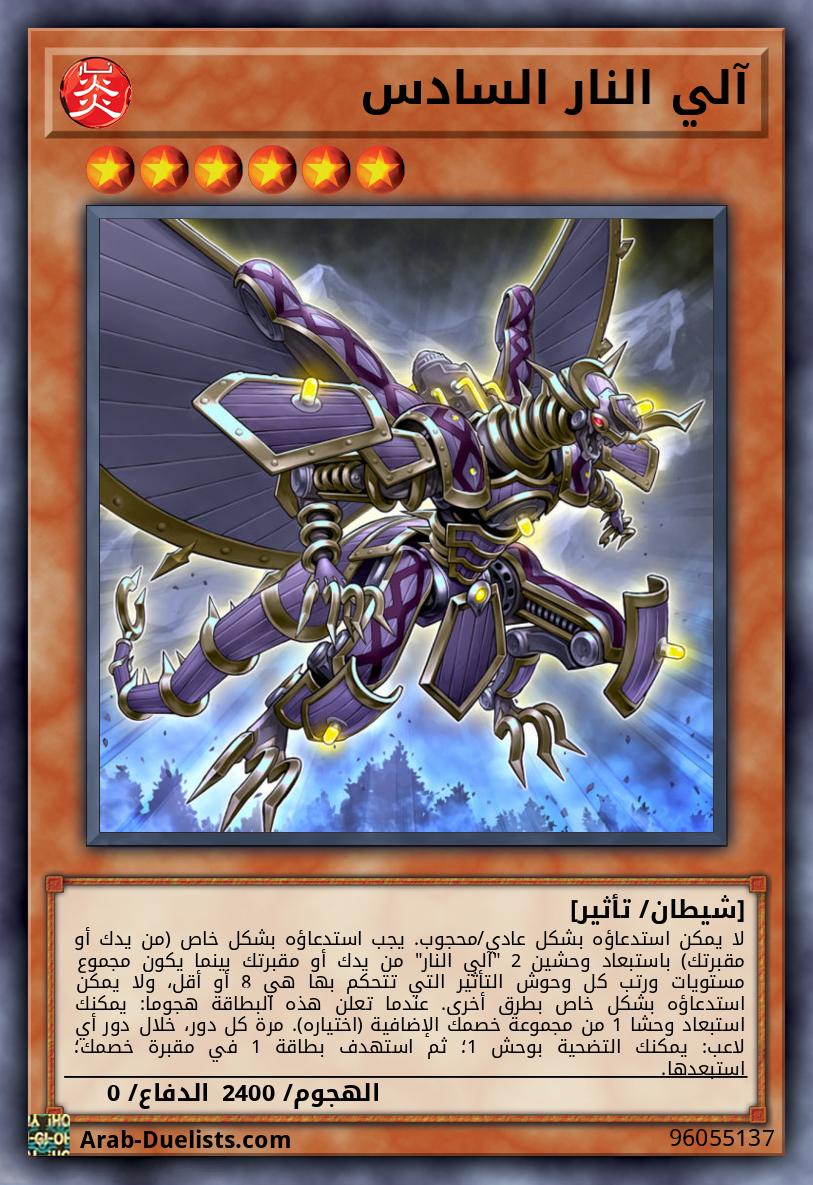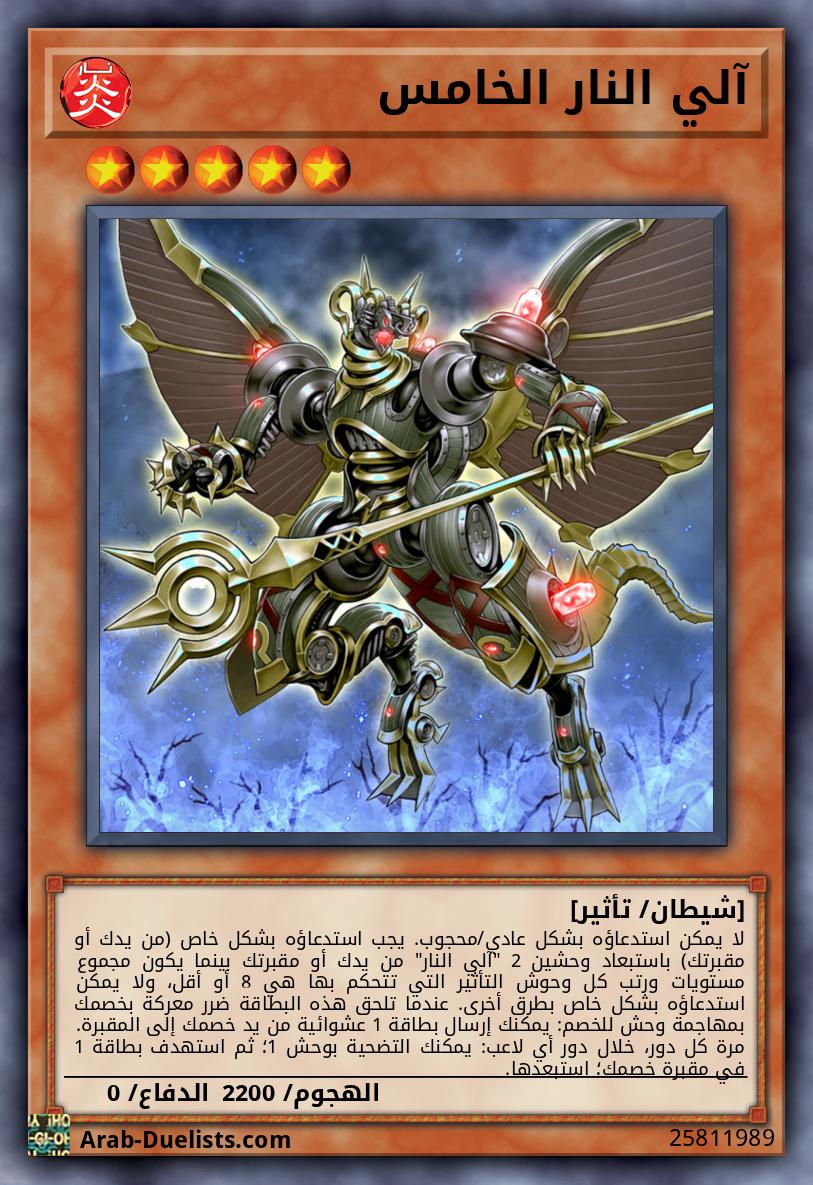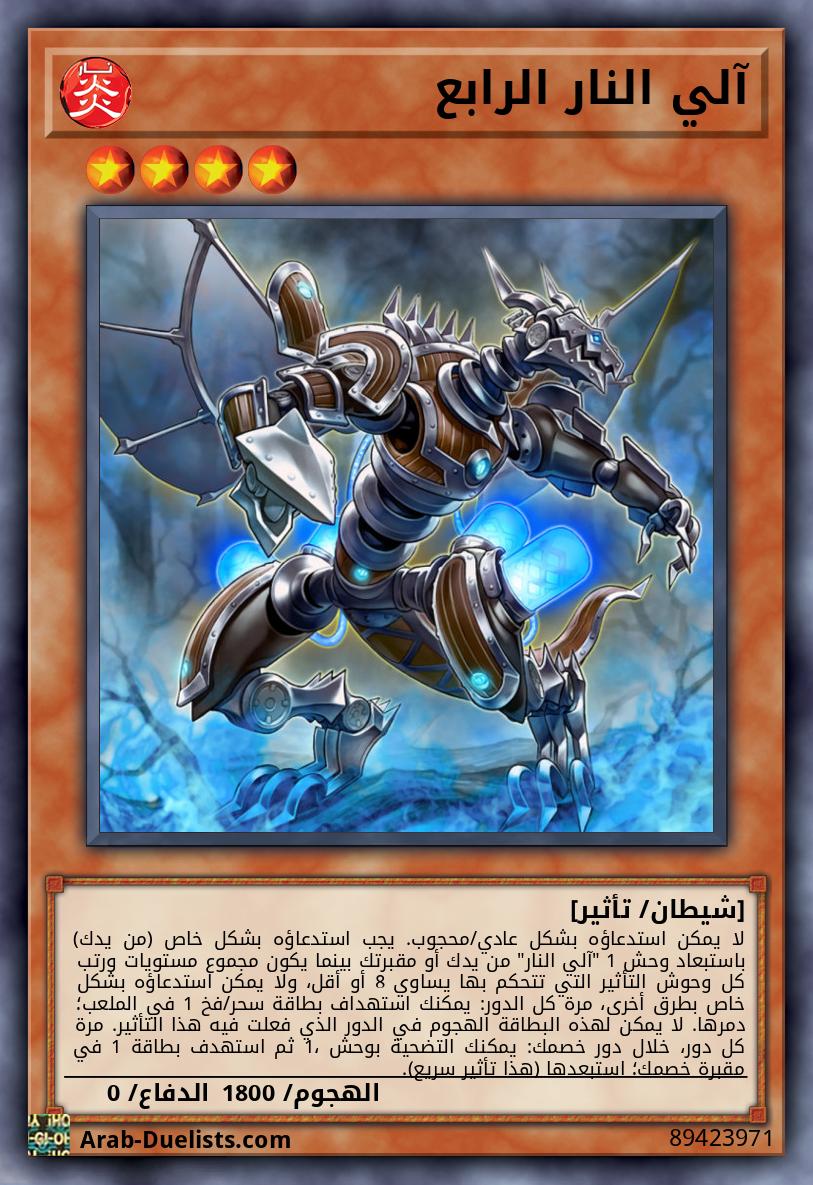 وحشان 2 "آلي النار" إذا تم استدعاء هذه البطاقة بالدمج: يمكنك استبعاد وحش 1 "آلي النار" من مقبرتك؛ أرسل وحوش "آلي النار" بأسماء مختلفة عن بعضها من مجموعتك إلى المقبرة بعددِ مساوِ لمستوى الوحش المُستَبعَد. إذا تم إرسال هذه البطاقة إلى المقبرة أو تم استبعادها: يمكنك إضافة سحر/فخ 1 "العدم" من مجموعتك إلى يدك. يمكنك فقط استخدام كل تأثير لـ"آلي النار الشرير" مرة كل دور.