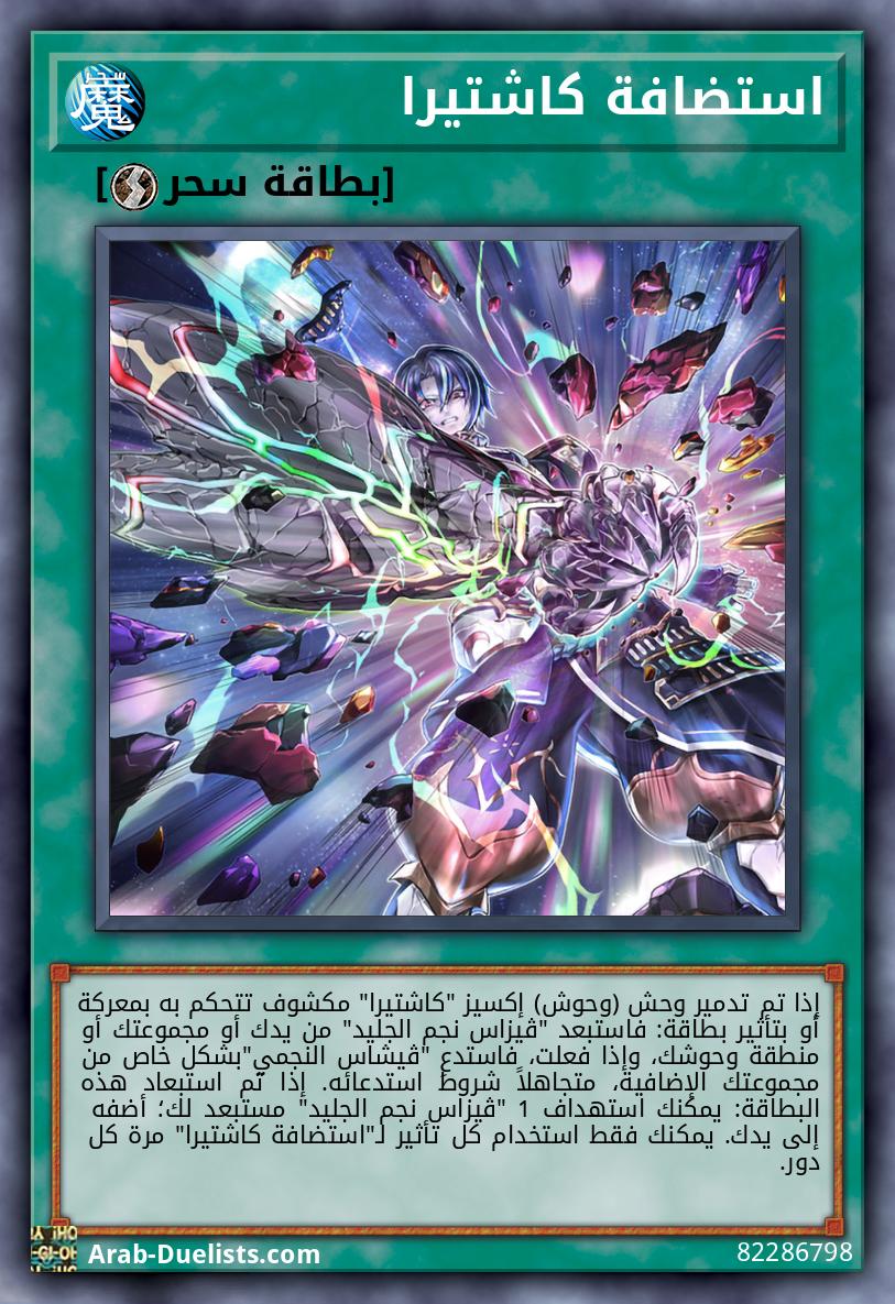 3 وحوش من المستوى 7 مرة كل دور، خلال الدور الذي تم فيه تفعيل تأثير(تأثيرات) "كاشتيرا شانغريرا"، يمكنك أيضًا استدعاء "كاشتيرا القلب الثائر" بالإكسيز باستخدام أي وحش "كاشتيرا" تتحكم به (انقل المواد المرفقة به لهذه البطاقة). يتم استبعاد أي بطاقة بدلاً من إرسالها للمقبرة. مرة كل سلسلة، في كل مرة يتم فيها استبعاد بطاقة(ـات): أرفق بطاقة 1 مستبعدة لهذه البطاقة كمادة. مرة كل دور (تأثير سريع): يمكنك فصل 3 مواد من هذه البطاقة ثم استهدف بطاقة 1 في الملعب؛ استبعدها بشكل محجوب.