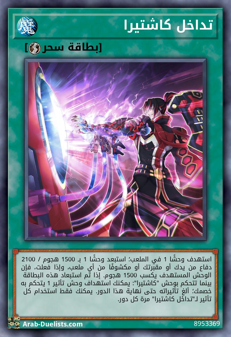 استهدف وحشًا 1 في الملعب؛ استبعد وحشًا 1 بـ 1500 هجوم / 2100 دفاع من يدك أو مقبرتك أو مكشوفًا من أي ملعب، وإذا فعلت، فإن الوحش المستهدف يكسب 1500 هجوم. إذا تم استبعاد هذه البطاقة بينما تتحكم بوحش "كاشتيرا": يمكنك استهداف وحش تأثير 1 يتحكم به خصمك؛ ألغِ تأثيراته حتى نهاية هذا الدور. يمكنك فقط استخدام كل تأثير لـ"تداخل كاشتيرا" مرة كل دور.