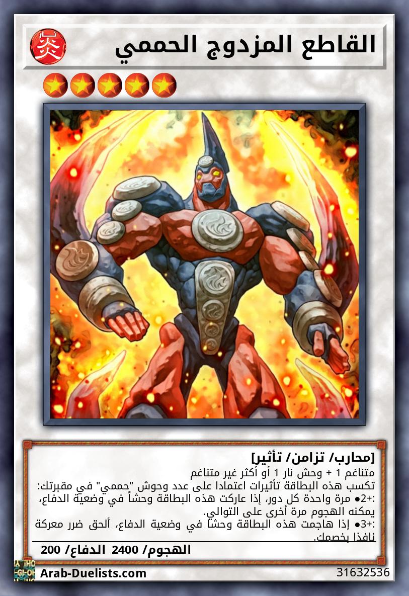 متناغم 1 + وحش نار 1 أو أكثر غير متناغم تكسب هذه البطاقة تأثيرات اعتمادا على عدد وحوش "حممي" في مقبرتك: ●2+: مرة واحدة كل دور، إذا عاركت هذه البطاقة وحشاً في وضعية الدفاع، يمكنه الهجوم مرة أخرى على التوالي. ●3+: إذا هاجمت هذه البطاقة وحشا في وضعية الدفاع، ألحق ضرر معركة نافذا بخصمك.