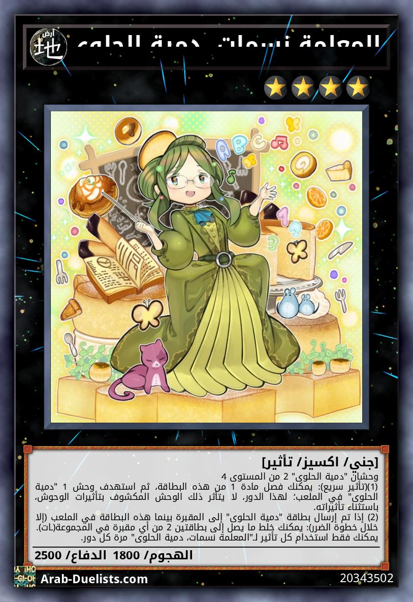 وحشان "دمية الحلوى" 2 من المستوى 4 (1)(تأثير سريع): يمكنك فصل مادة 1 من هذه البطاقة، ثم استهدف وحش 1 "دمية الحلوى" في الملعب؛ لهذا الدور، لا يتأثر ذلك الوحش المكشوف بتأثيرات الوحوش، باستثناء تأثيراته. (2) إذا تم إرسال بطاقة "دمية الحلوى" إلى المقبرة بينما هذه البطاقة في الملعب (إلا خلال خطوة الضرر): يمكنك خلط ما يصل إلى بطاقتين 2 من أي مقبرة في المجموعة(ـات). يمكنك فقط استخدام كل تأثير لـ"المعلمة نسمات، دمية الحلوى" مرة كل دور.