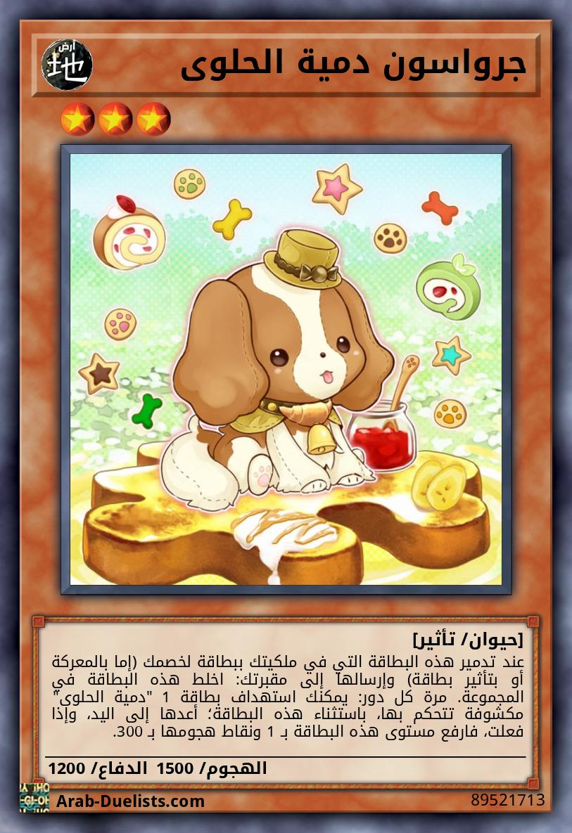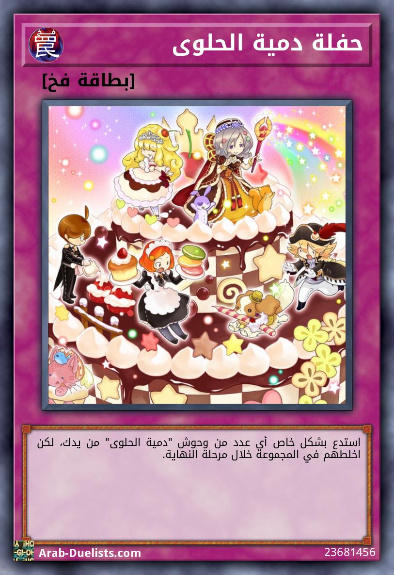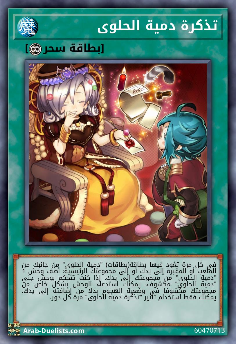 وحشان 2 "دمية الحلوى" بينما هذه البطاقة تشير لوحش "دمية الحلوى"، لا يمكن تدمير بطاقات سحر/فخ "دمية الحلوى" التي تتحكم بها بتأثيرات البطاقات، أيضا لا يمكن لأي لاعب استهدافهم بتأثيرات البطاقات. إذا كان سيتم تدمير هذه البطاقة في الملعب بمعركة أو بتأثير بطاقة، فيمكنك خلط وحش 1 "دمية الحلوى" من مقبرتك إلى المجموعة بدلا من ذلك.