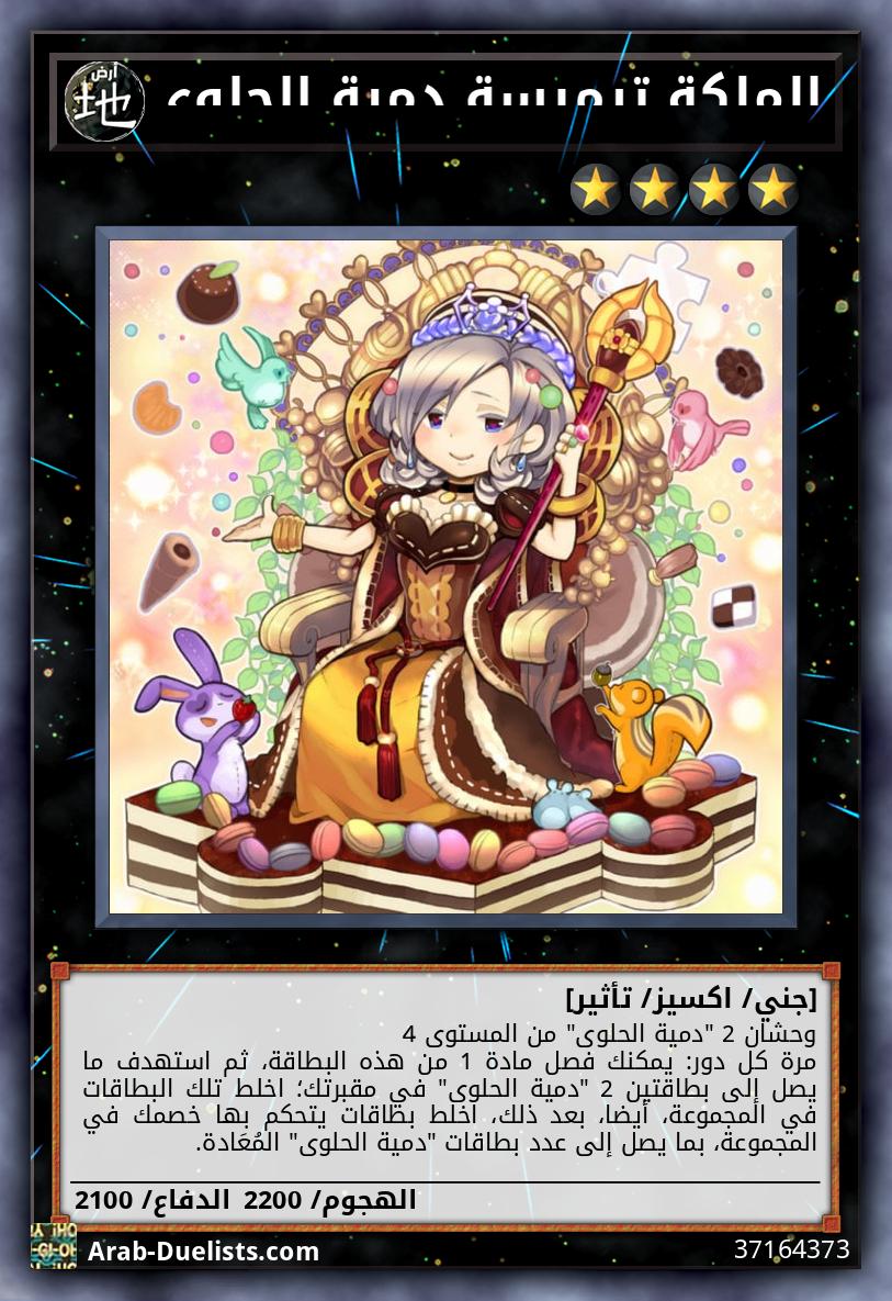 3 وحوش "دمية الحلوى" من المستوى 5 (1) مرة كل دورة، يمكنك أيضًا استدعاؤها باستخدام "الملكة ترميسة دمية الحلوى" تتحكم بها. (نقل موادها إلى هذه البطاقة). (2) مرة كل دورة للخصم (تأثير سريع): يمكنك فصل مادة 1 من هذه البطاقة، ثم استهدف ما يصل إلى بطاقتين 2 "دمية الحلوى" في مقبرتك؛ واخلطهما في المجموعة، كما يمكنك خلط نفس العدد من البطاقات التي يتحكم بها خصمك إلى المجموعة. (3) إذا تم تدمير هذه البطاقة التي تتحكم بها ببطاقة للخصم وأرسِلَت إلى مقبرتك: فأعد هذه البطاقة إلى المجموعة الإضافية.