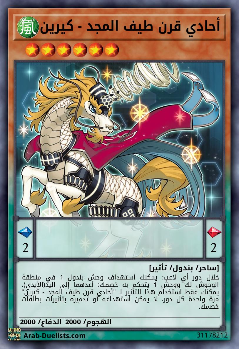 خلال دور أي لاعب: يمكنك استهداف وحش بندول 1 في منطقة الوحوش لك ووحش 1 يتحكم به خصمك؛ أعدهما إلى اليد(الأيدي). يمكنك فقط استخدام هذا التأثير لـ "أحادي قرن طيف المجد - كيرين" مرة واحدة كل دور. لا يمكن استهدافه أو تدميره بتأثيرات بطاقات خصمك.