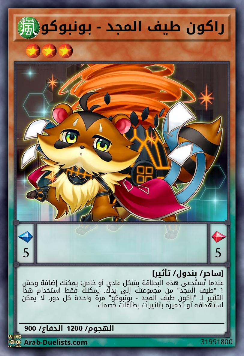 عندما تُستَدعى هذه البطاقة بشكل عادي أو خاص: يمكنك إضافة وحش 1 "طيف المجد" من مجموعتك إلى يدك. يمكنك فقط استخدام هذا التأثير لـ "راكون طيف المجد - بونبوكو" مرة واحدة كل دور. لا يمكن استهدافه أو تدميره بتأثيرات بطاقات خصمك.