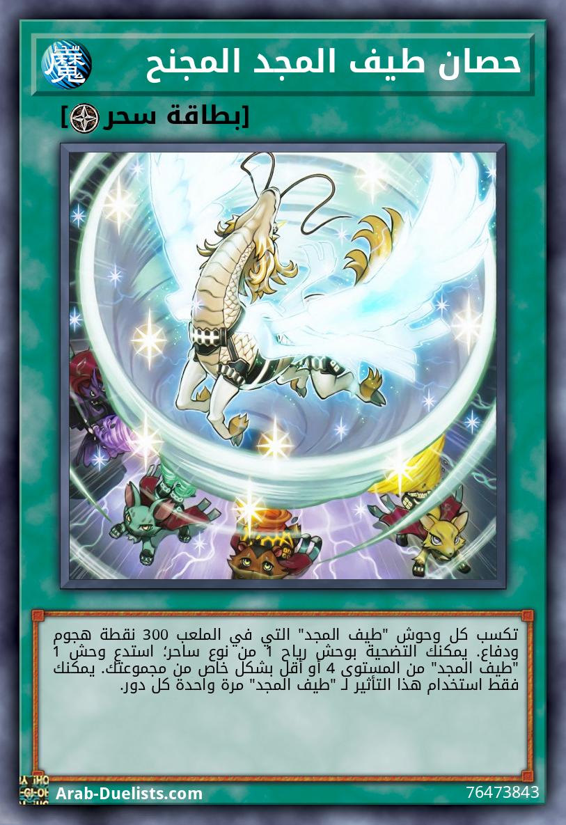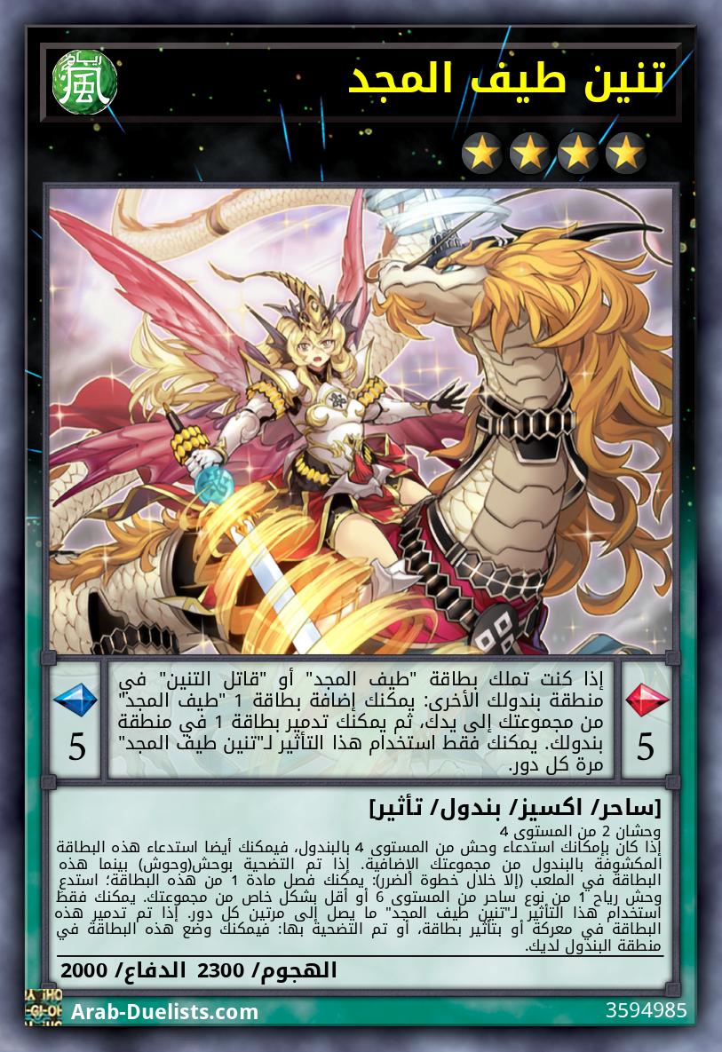 وحشان 2 من المستوى 4 إذا كان بإمكانك استدعاء وحش من المستوى 4 بالبندول، فيمكنك أيضا استدعاء هذه البطاقة المكشوفة بالبندول من مجموعتك الإضافية. إذا تم التضحية بوحش(وحوش) بينما هذه البطاقة في الملعب (إلا خلال خطوة الضرر): يمكنك فصل مادة 1 من هذه البطاقة؛ استدعِ وحش رياح 1 من نوع ساحر من المستوى 6 أو أقل بشكل خاص من مجموعتك. يمكنك فقط استخدام هذا التأثير لـ"تنين طيف المجد" ما يصل إلى مرتين كل دور. إذا تم تدمير هذه البطاقة في معركة أو بتأثير بطاقة، أو تم التضحية بها: فيمكنك وضع هذه البطاقة في منطقة البندول لديك.