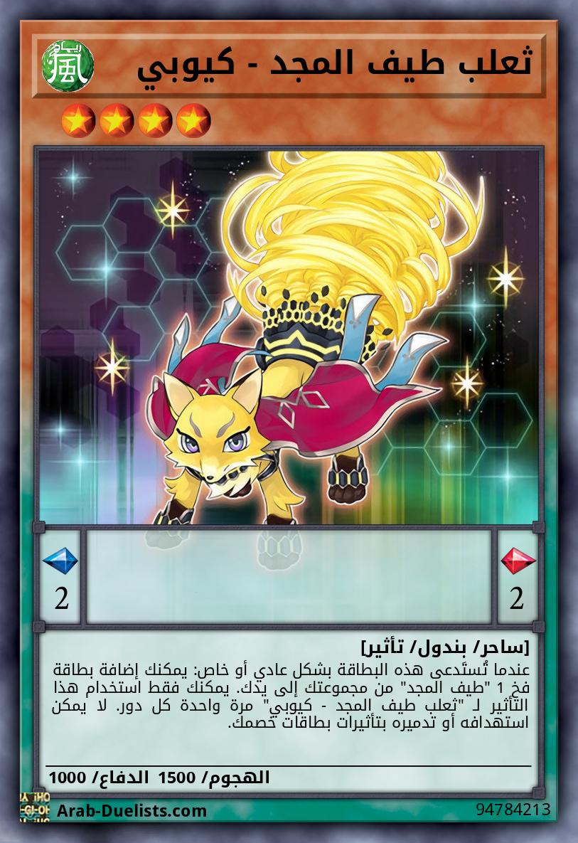 عندما تُستَدعى هذه البطاقة بشكل عادي أو خاص: يمكنك إضافة بطاقة فخ 1 "طيف المجد" من مجموعتك إلى يدك. يمكنك فقط استخدام هذا التأثير لـ "ثعلب طيف المجد - كيوبي" مرة واحدة كل دور. لا يمكن استهدافه أو تدميره بتأثيرات بطاقات خصمك.