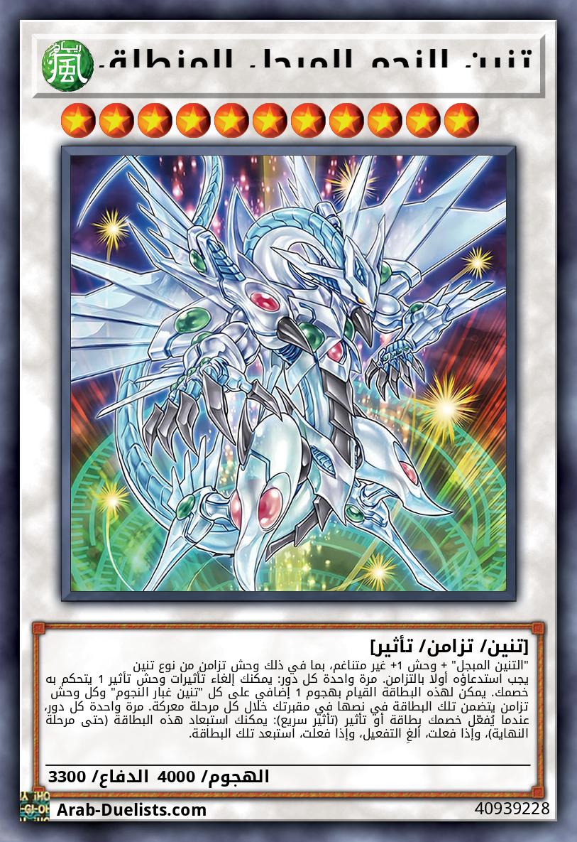 "التنين المبجل" + "تنين غبار النجوم" + وحش 1+ غير متناغم خلال دور أي لاعب، عندما يُفعّل خصمك بطاقة أو تأثير (تأثير سريع): يمكنك التضحية بهذه البطاقة؛ ألغِ التفعيل، وإذا فعلت، دمّر جميع البطاقات التي يتحكم بها خصمك. مرة واحدة كل دور، استهدف وحشا 1 يتحكم به خصمك؛ ألغ تأثيراته حتى نهاية هذا الدور، ويمكنك تفعيل 1 من تأثيراته كتأثيرات هذه البطاقة مرة واحدة في هذاا الدور. خلال مرحلة النهاية: استهدف 1 "تنين غبار النجوم" في مقبرتك؛ ثم أعد هذه البطاقة من الملعب إلى مجموعتك الإضافية، ثمّ استدع ذلك الهدف بشكل خاص.