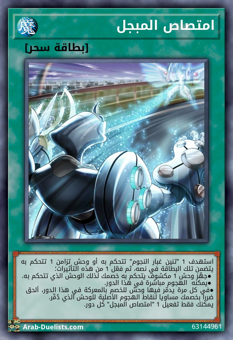 استهدف 1 "تنين غبار النجوم" تتحكم به أو وحش تزامن 1 تتحكم به يتضمن تلك البطاقة في نصه، ثم فعّل 1 من هذه التأثيرات؛ ●جهّز وحش 1 مكشوف يتحكم به خصمك لذلك الوحش الذي تتحكم به. ●يمكنه الهجوم مباشرة في هذا الدور. ●في كل مرة يدمّر فيها وحش للخصم بالمعركة في هذا الدور، ألحق ضررا بخصمك مساويا لنقاط الهجوم الأصلية للوحش الذي دُمِّر. يمكنك فقط تفعيل 1 "امتصاص المبجل" كل دور.