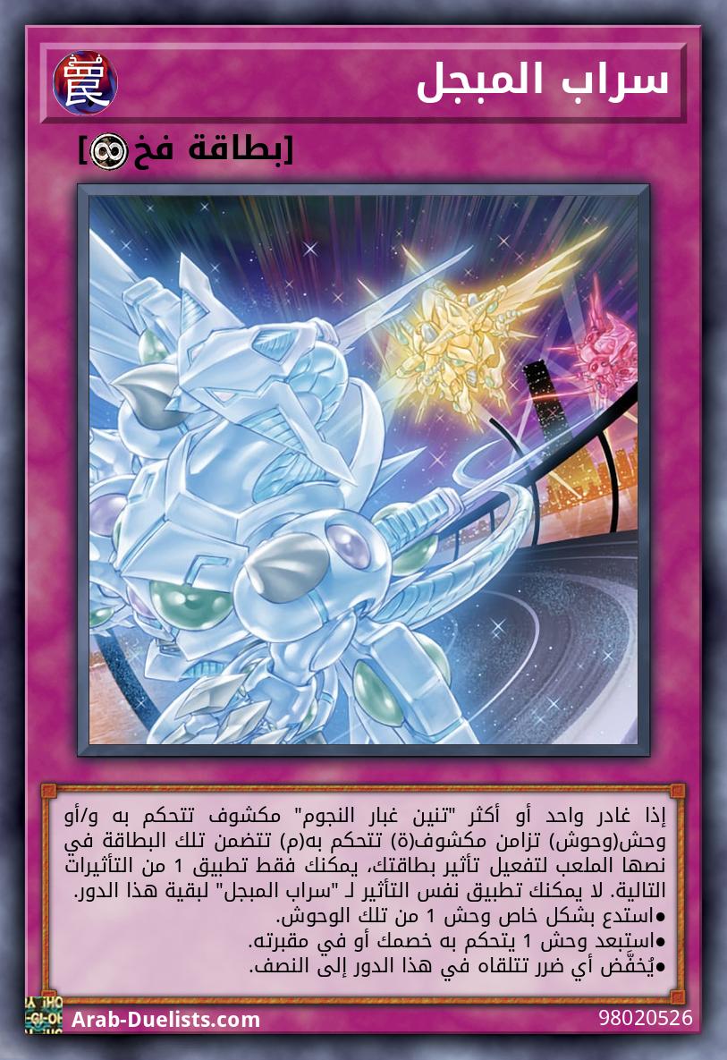 إذا غادر واحد أو أكثر "تنين غبار النجوم" مكشوف تتحكم به و/أو وحش(وحوش) تزامن مكشوف(ة) تتحكم به(م) تتضمن تلك البطاقة في نصها الملعب لتفعيل تأثير بطاقتك، يمكنك فقط تطبيق 1 من التأثيرات التالية. لا يمكنك تطبيق نفس التأثير لـ "سراب المبجل" لبقية هذا الدور. ●استدع بشكل خاص وحش 1 من تلك الوحوش. ●استبعد وحش 1 يتحكم به خصمك أو في مقبرته. ●يُخفَّض أي ضرر تتلقاه في هذا الدور إلى النصف.