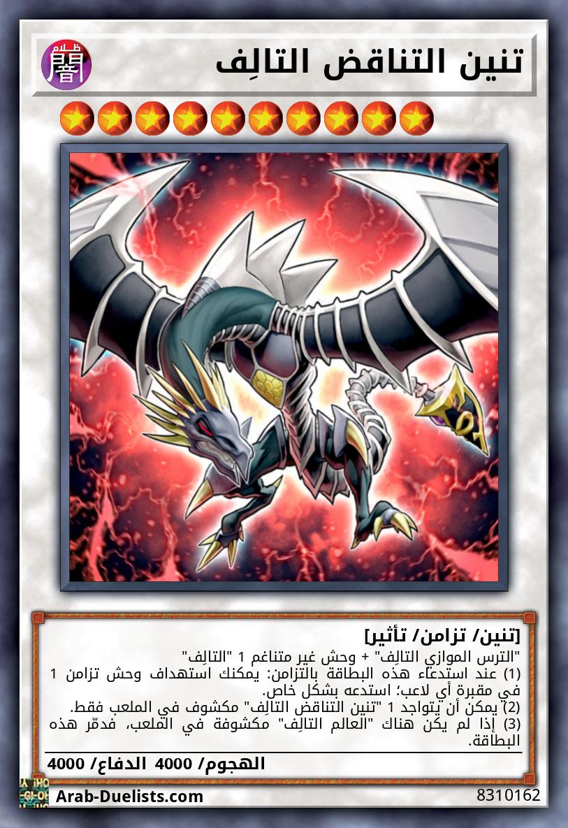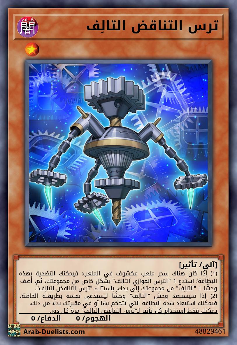 "الترس الموازي التالِف" + وحش غير متناغم 1 "التالِف" (1) عند استدعاء هذه البطاقة بالتزامن: يمكنك استهداف وحش تزامن 1 في مقبرة أي لاعب؛ استدعه بشكل خاص. (2) يمكن أن يتواجد 1 "تنين التناقض التالِف" مكشوف في الملعب فقط. (3) إذا لم يكن هناك "العالم التالِف" مكشوفة في الملعب، فدمّر هذه البطاقة.