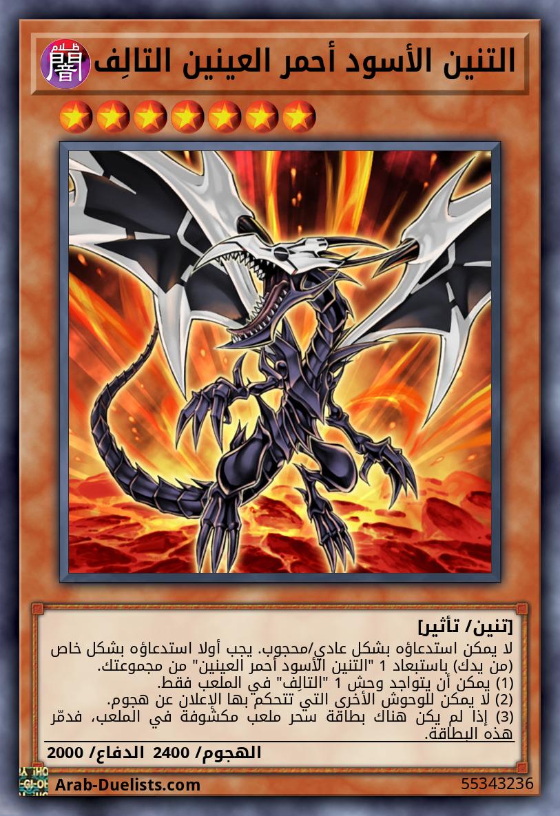 لا يمكن استدعاؤه بشكل عادي/محجوب. يجب أولا استدعاؤه بشكل خاص (من يدك) باستبعاد 1 "التنين الأسود أحمر العينين" من مجموعتك. (1) يمكن أن يتواجد وحش 1 "التالِف" في الملعب فقط. (2) لا يمكن للوحوش الأخرى التي تتحكم بها الإعلان عن هجوم. (3) إذا لم يكن هناك بطاقة سحر ملعب مكشوفة في الملعب، فدمّر هذه البطاقة.