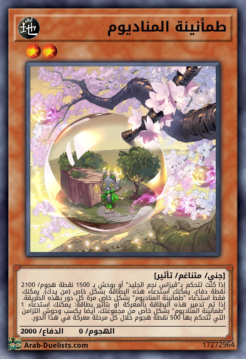 إذا كنت تتحكم بـ"ڤيزاس نجم الجليد" أو بوحش بـ 1500 نقطة هجوم/ 2100 نقطة دفاع، يمكنك استدعاء هذه البطاقة بشكل خاص (من يدك). يمكنك فقط استدعاء "طمأنينة المناديوم" بشكل خاص مرة كل دور بهذه الطريقة. إذا تم تدمير هذه البطاقة بالمعركة أو بتأثير بطاقة: يمكنك استدعاء 1 "طمأنينة المناديوم" بشكل خاص من مجموعتك، أيضا يكسب وحوش التزامن التي تتحكم بها 500 نقطة هجوم خلال كل مرحلة معركة في هذا الدور.