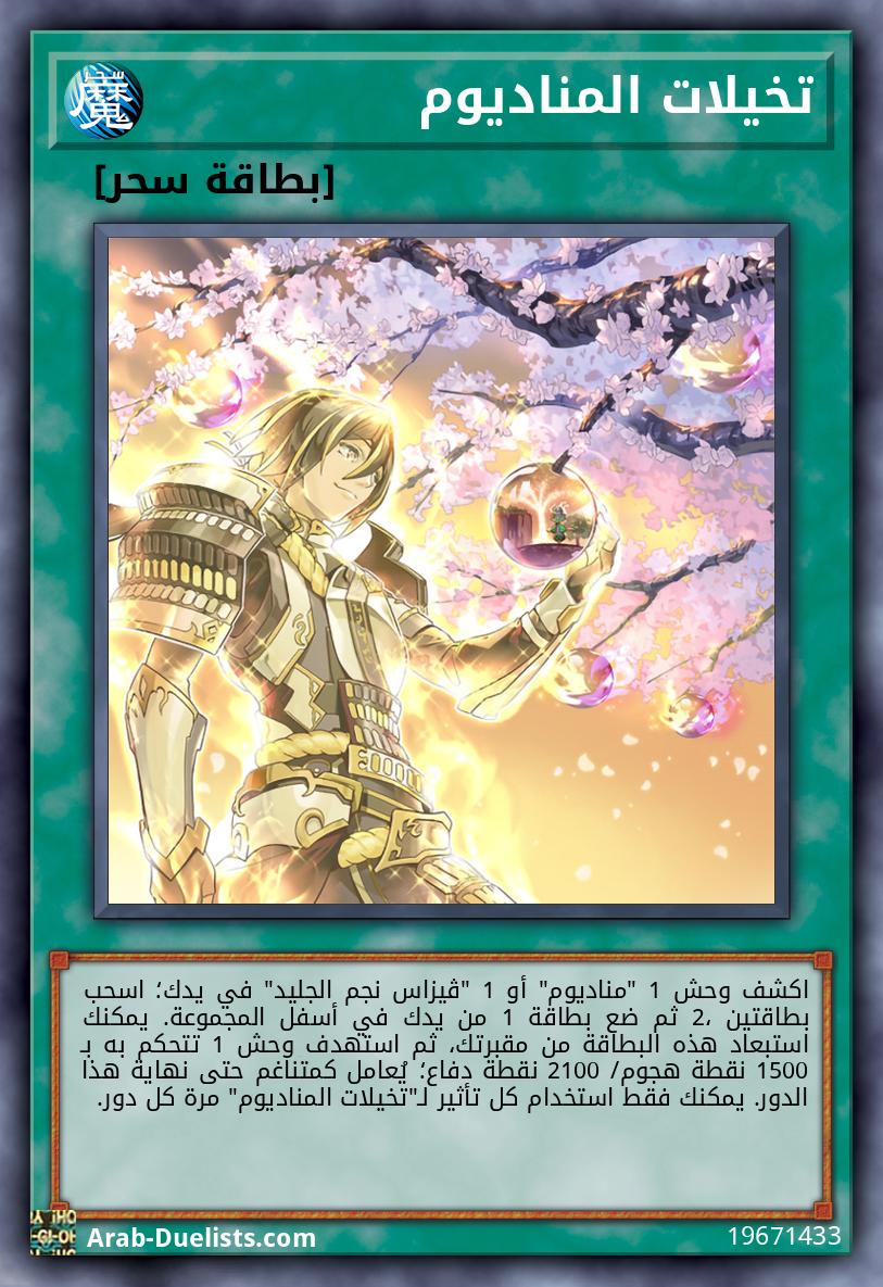 اكشف وحش 1 "مناديوم" أو 1 "ڤيزاس نجم الجليد" في يدك؛ اسحب بطاقتين 2، ثم ضع بطاقة 1 من يدك في أسفل المجموعة. يمكنك استبعاد هذه البطاقة من مقبرتك، ثم استهدف وحش 1 تتحكم به بـ 1500 نقطة هجوم/ 2100 نقطة دفاع؛ يُعامل كمتناغم حتى نهاية هذا الدور. يمكنك فقط استخدام كل تأثير لـ"تخيلات المناديوم" مرة كل دور.