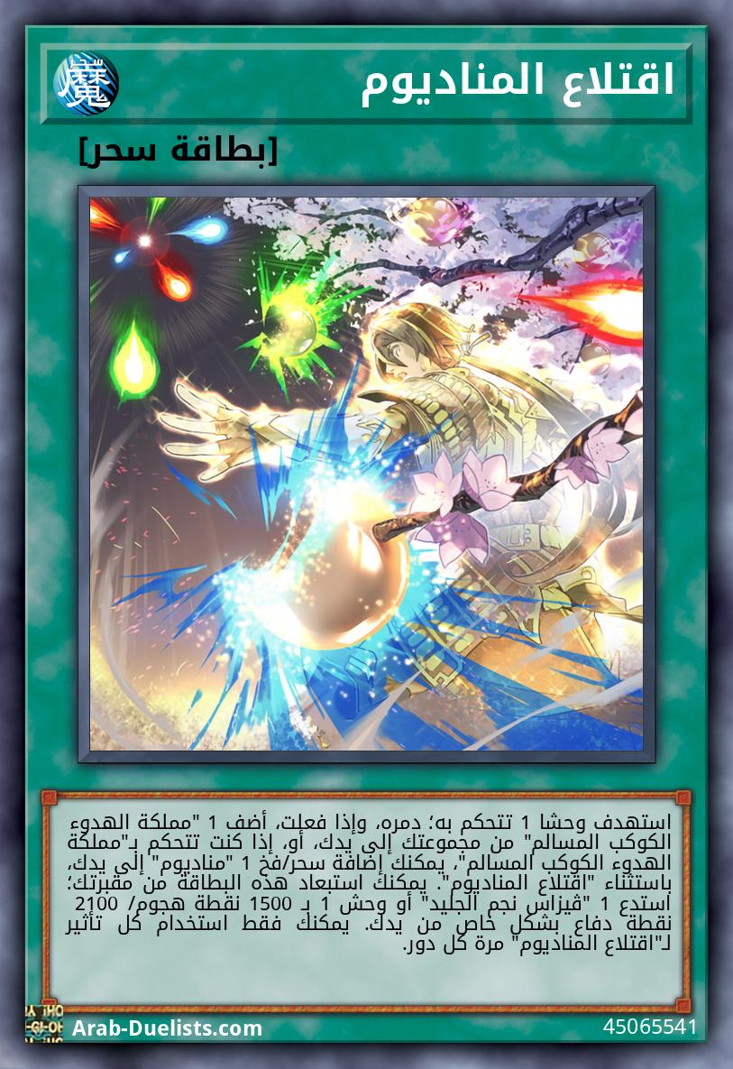 استهدف وحشا 1 تتحكم به؛ دمره، وإذا فعلت، أضف 1 "مملكة الهدوء الكوكب المسالم" من مجموعتك إلى يدك، أو، إذا كنت تتحكم بـ"مملكة الهدوء الكوكب المسالم"، يمكنك إضافة سحر/فخ 1 "مناديوم" إلى يدك، باستثناء "اقتلاع المناديوم". يمكنك استبعاد هذه البطاقة من مقبرتك؛ استدع 1 "ڤيزاس نجم الجليد" أو وحش 1 بـ 1500 نقطة هجوم/ 2100 نقطة دفاع بشكل خاص من يدك. يمكنك فقط استخدام كل تأثير لـ"اقتلاع المناديوم" مرة كل دور.