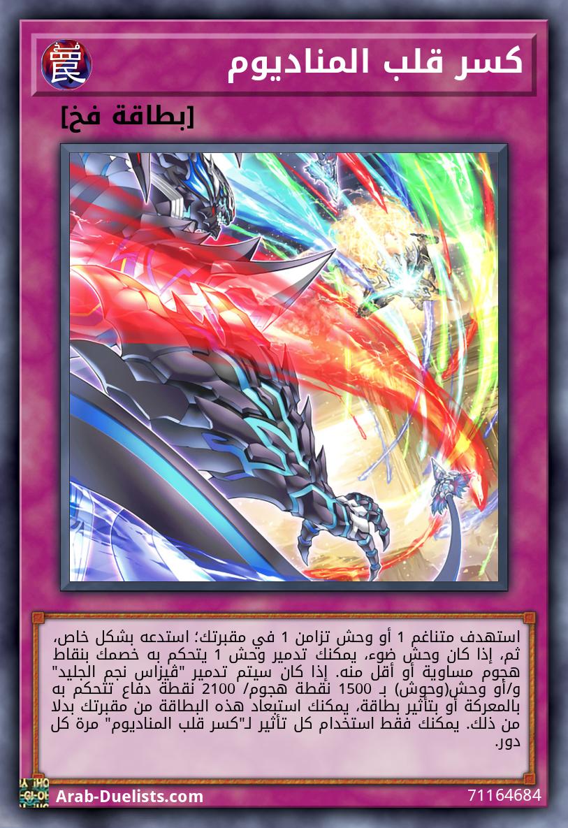 استهدف متناغم 1 أو وحش تزامن 1 في مقبرتك؛ استدعه بشكل خاص، ثم، إذا كان وحش ضوء، يمكنك تدمير وحش 1 يتحكم به خصمك بنقاط هجوم مساوية أو أقل منه. إذا كان سيتم تدمير "ڤيزاس نجم الجليد" و/أو وحش(وحوش) بـ 1500 نقطة هجوم/ 2100 نقطة دفاع تتحكم به بالمعركة أو بتأثير بطاقة، يمكنك استبعاد هذه البطاقة من مقبرتك بدلا من ذلك. يمكنك فقط استخدام كل تأثير لـ"كسر قلب المناديوم" مرة كل دور.