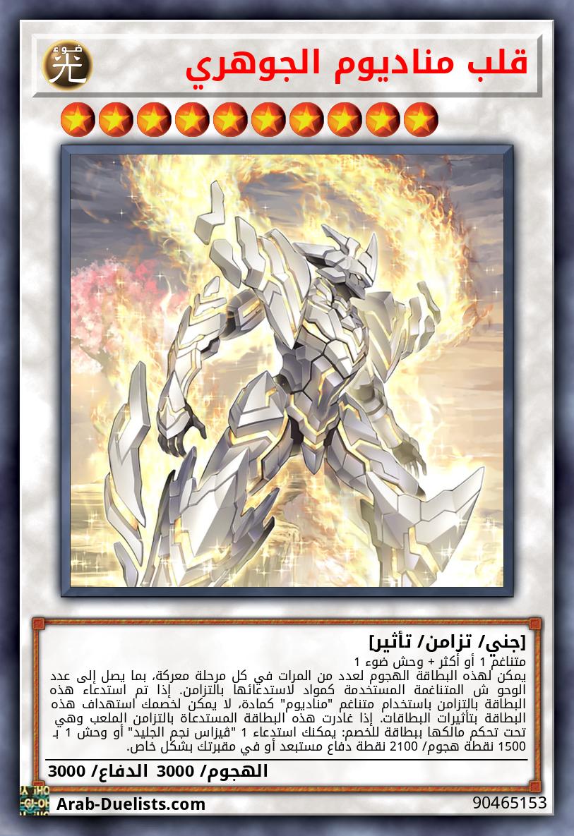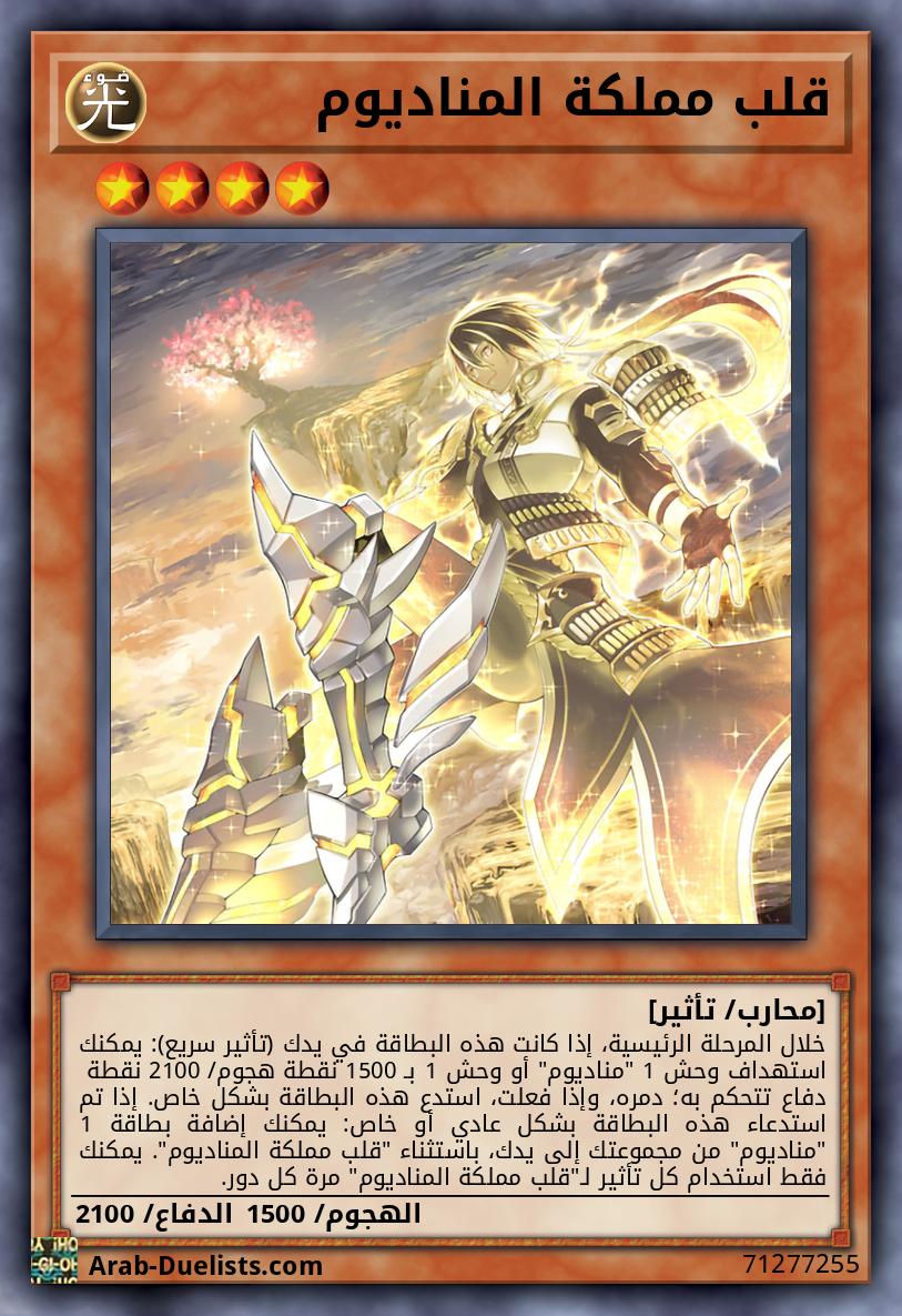خلال المرحلة الرئيسية، إذا كانت هذه البطاقة في يدك (تأثير سريع): يمكنك استهداف وحش 1 "مناديوم" أو وحش 1 بـ 1500 نقطة هجوم/ 2100 نقطة دفاع تتحكم به؛ دمره، وإذا فعلت، استدع هذه البطاقة بشكل خاص. إذا تم استدعاء هذه البطاقة بشكل عادي أو خاص: يمكنك إضافة بطاقة 1 "مناديوم" من مجموعتك إلى يدك، باستثناء "قلب مملكة المناديوم". يمكنك فقط استخدام كل تأثير لـ"قلب مملكة المناديوم" مرة كل دور.