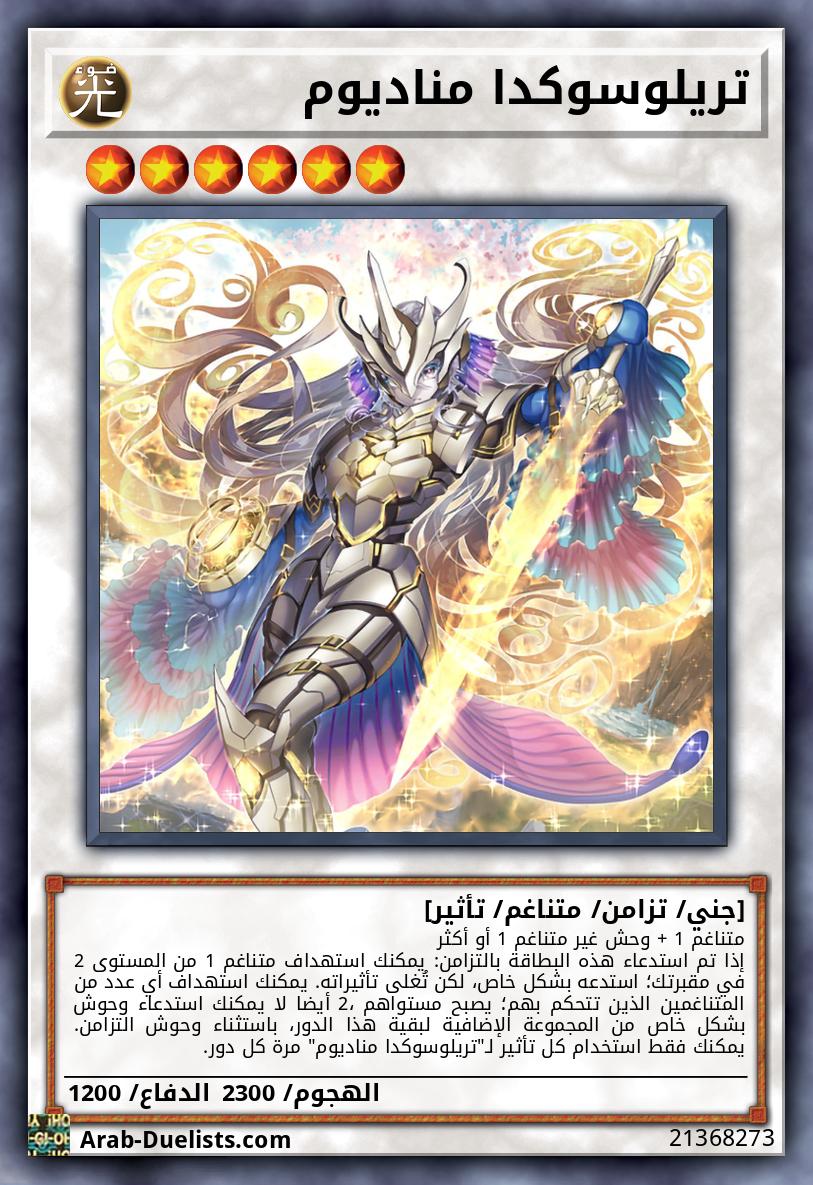 متناغم 1 + وحش غير متناغم 1 أو أكثر إذا تم استدعاء هذه البطاقة بالتزامن: يمكنك استهداف متناغم 1 من المستوى 2 في مقبرتك؛ استدعه بشكل خاص، لكن تُغلى تأثيراته. يمكنك استهداف أي عدد من المتناغمين الذين تتحكم بهم؛ يصبح مستواهم 2، أيضا لا يمكنك استدعاء وحوش بشكل خاص من المجموعة الإضافية لبقية هذا الدور، باستثناء وحوش التزامن. يمكنك فقط استخدام كل تأثير لـ"تريلوسوكدا مناديوم" مرة كل دور.