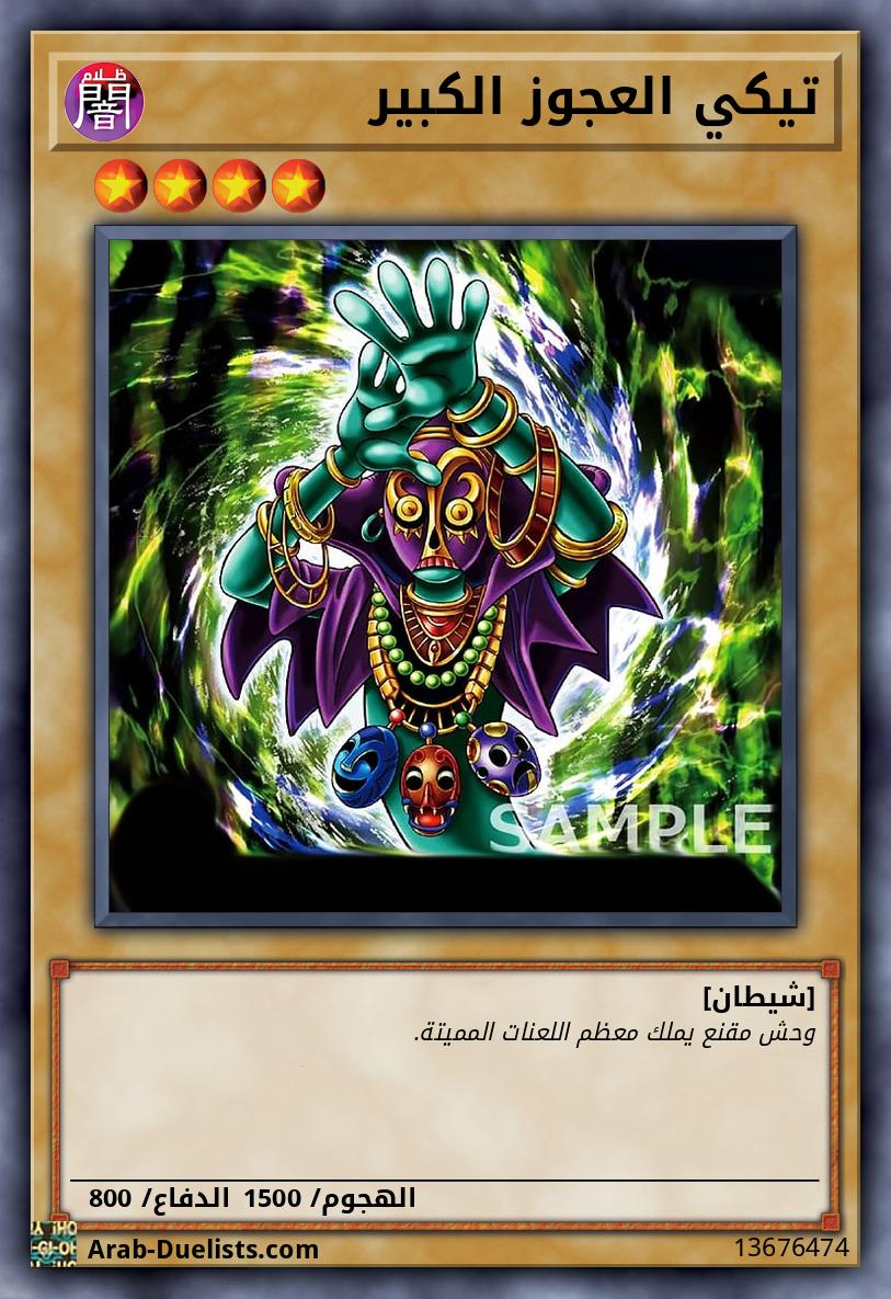 لا يمكن استدعاؤه بشكل عادي أو خاص. يجب أولا استدعاؤه بشكل خاص (من يدك) بالتضحية بوحشين 2، بما في ذلك على الأقل 1 "تيكي العجوز الكبير" أو "ميلشيد الحيوان رباعي الأوجه". إذا أُرسلت هذه البطاقة من الملعب إلى مقبرتك: استهدف وحشا 1 مكشوفا يتحكم به خصمك؛ جهّزه بـ1 "قناع الرُّفَات" من مجموعتك.