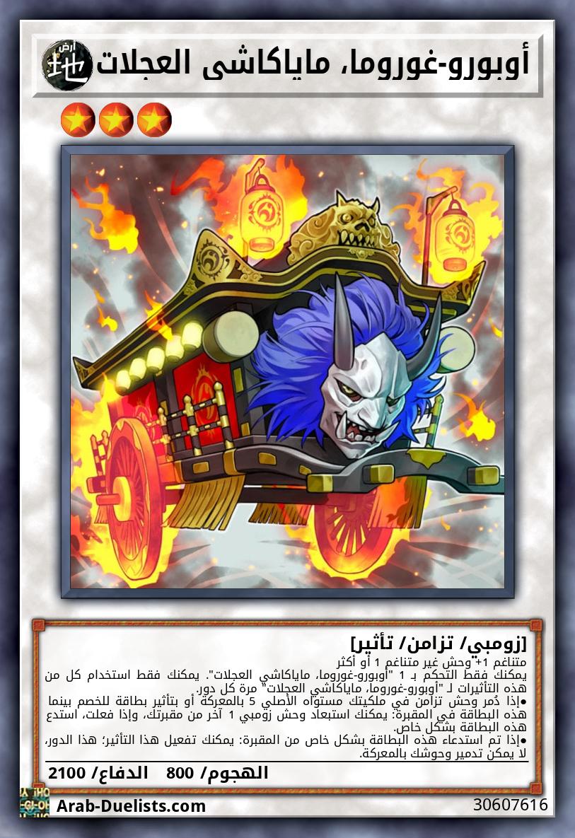 متناغم 1+ وحش غير متناغم 1 أو أكثر يمكنك فقط التحكم بـ 1 "أوبورو-غوروما، ماياكاشي العجلات". يمكنك فقط استخدام كل من هذه التأثيرات لـ "أوبورو-غوروما، ماياكاشي العجلات" مرة كل دور. ●إذا دُمر وحش تزامن في ملكيتك مستواه الأصلي 5 بالمعركة أو بتأثير بطاقة للخصم بينما هذه البطاقة في المقبرة: يمكنك استبعاد وحش زومبي 1 آخر من مقبرتك، وإذا فعلت، استدع هذه البطاقة بشكل خاص. ●إذا تم استدعاء هذه البطاقة بشكل خاص من المقبرة: يمكنك تفعيل هذا التأثير؛ هذا الدور، لا يمكن تدمير وحوشك بالمعركة.