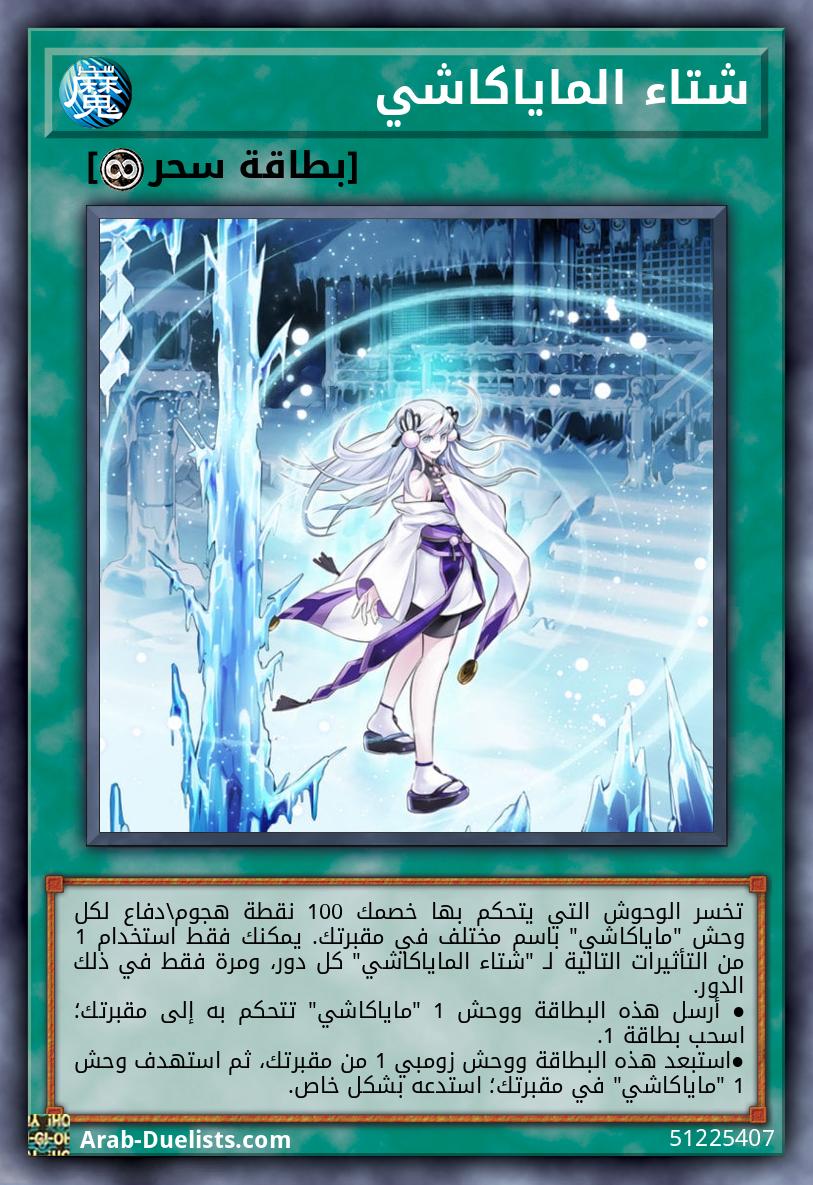 تخسر الوحوش التي يتحكم بها خصمك 100 نقطة هجوم\دفاع لكل وحش "ماياكاشي" باسم مختلف في مقبرتك. يمكنك فقط استخدام 1 من التأثيرات التالية لـ "شتاء الماياكاشي" كل دور، ومرة فقط في ذلك الدور. ● أرسل هذه البطاقة ووحش 1 "ماياكاشي" تتحكم به إلى مقبرتك؛ اسحب بطاقة 1. ●استبعد هذه البطاقة ووحش زومبي 1 من مقبرتك، ثم استهدف وحش 1 "ماياكاشي" في مقبرتك؛ استدعه بشكل خاص.
