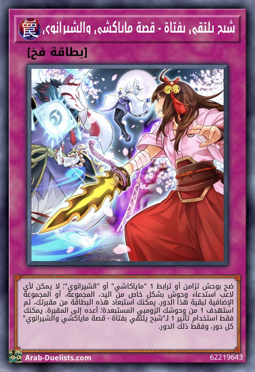 ضحِ بوحش تزامن أو ترابط 1 "ماياكاشي" أو "الشيرانوي"؛ لا يمكن لأي لاعب استدعاء وحوش بشكل خاص من اليد، المجموعة، أو المجموعة الإضافية لبقية هذا الدور. يمكنك استبعاد هذه البطاقة من مقبرتك، ثم استهدف 1 من وحوشك الزومبي المستبعدة؛ أعده إلى المقبرة. يمكنك فقط استخدام تأثير 1 لـ"شبح يلتقي بفتاة - قصة ماياكشي والشيرانوي" كل دور، وفقط ذلك الدور.