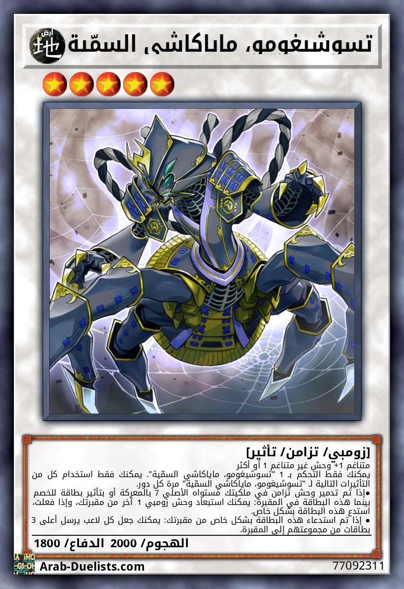 متناغم 1+ وحش غير متناغم 1 أو أكثر يمكنك فقط التحكم بـ 1 "تسوشيغومو، ماياكاشي السمّية". يمكنك فقط استخدام كل من التأثيرات التالية لـ "تسوشيغومو، ماياكاشي السمّية" مرة كل دور. ●إذا تم تدمير وحش تزامن في ملكيتك مستواه الأصلي 7 بالمعركة أو بتأثير بطاقة للخصم بينما هذه البطاقة في المقبرة: يمكنك استبعاد وحش زومبي 1 آخر من مقبرتك، وإذا فعلت، استدع هذه البطاقة بشكل خاص. ● إذا تم استدعاء هذه البطاقة بشكل خاص من مقبرتك: يمكنك جعل كل لاعب يرسل أعلى 3 بطاقات من مجموعتهم إلى المقبرة.