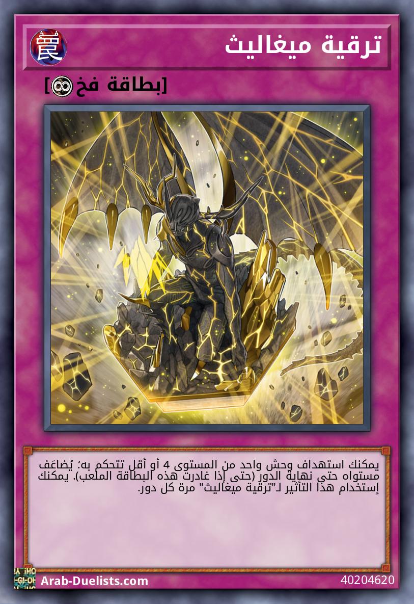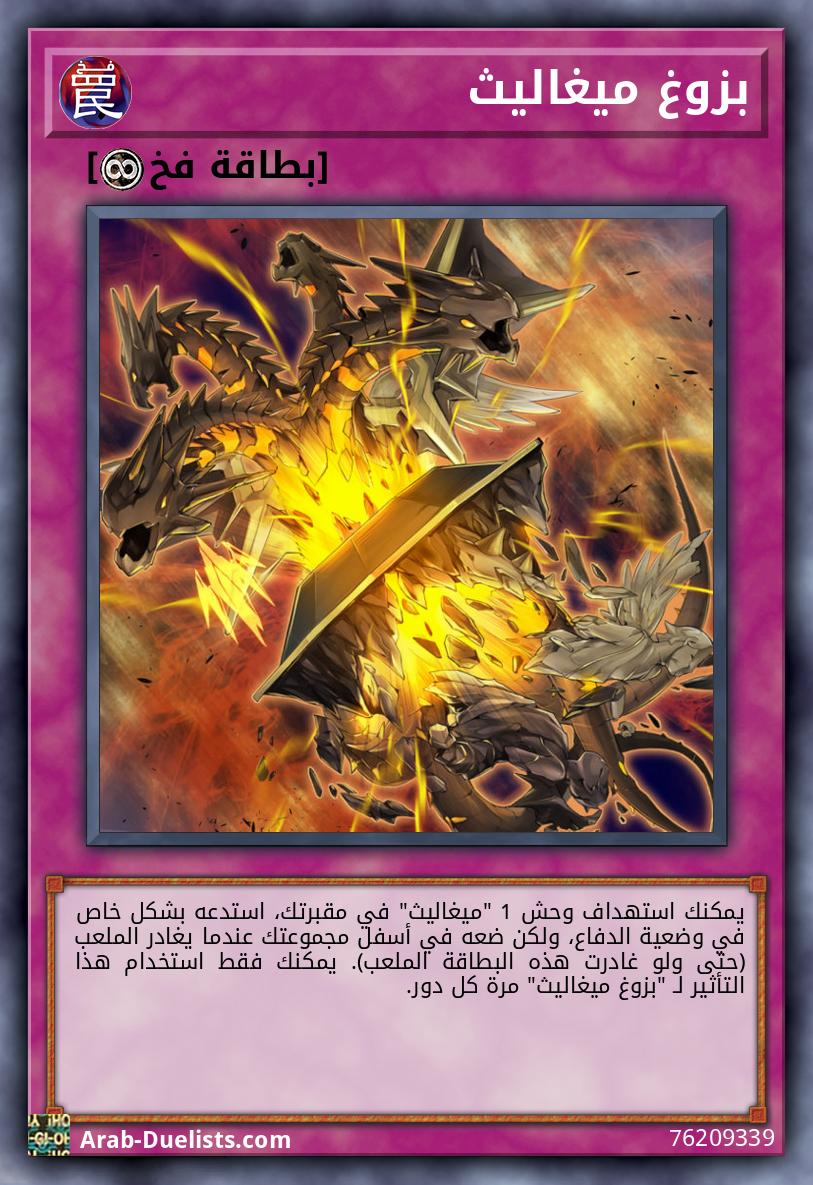 يمكنك استهداف وحش 1 "ميغاليث" في مقبرتك، استدعه بشكل خاص في وضعية الدفاع، ولكن ضعه في أسفل مجموعتك عندما يغادر الملعب (حتى ولو غادرت هذه البطاقة الملعب). يمكنك فقط استخدام هذا التأثير لـ "بزوغ ميغاليث" مرة كل دور.