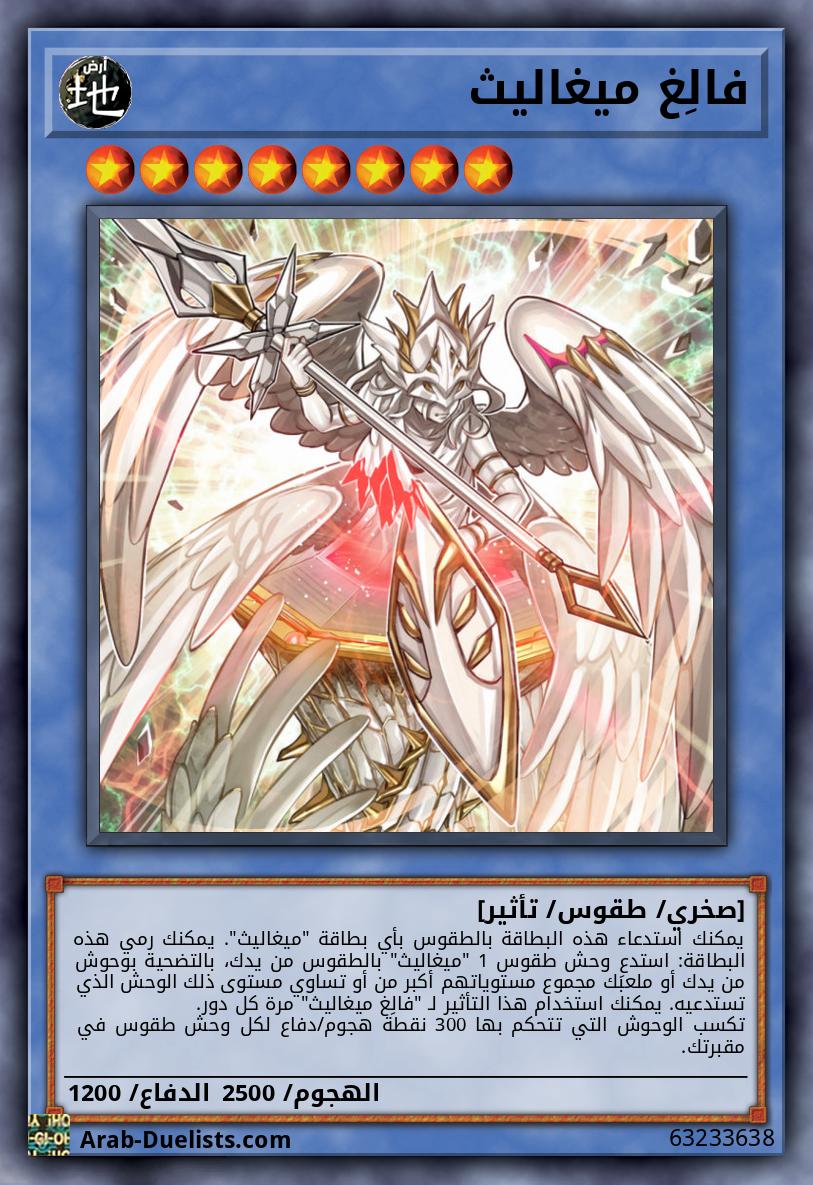 يمكنك استدعاء هذه البطاقة بالطقوس بأي بطاقة "ميغاليث". يمكنك رمي هذه البطاقة: استدعِ وحش طقوس 1 "ميغاليث" بالطقوس من يدك، بالتضحية بوحوش من يدك أو ملعبك مجموع مستوياتهم أكبر من أو تساوي مستوى ذلك الوحش الذي تستدعيه. يمكنك استخدام هذا التأثير لـ "فالِغ ميغاليث" مرة كل دور. تكسب الوحوش التي تتحكم بها 300 نقطة هجوم/دفاع لكل وحش طقوس في مقبرتك.