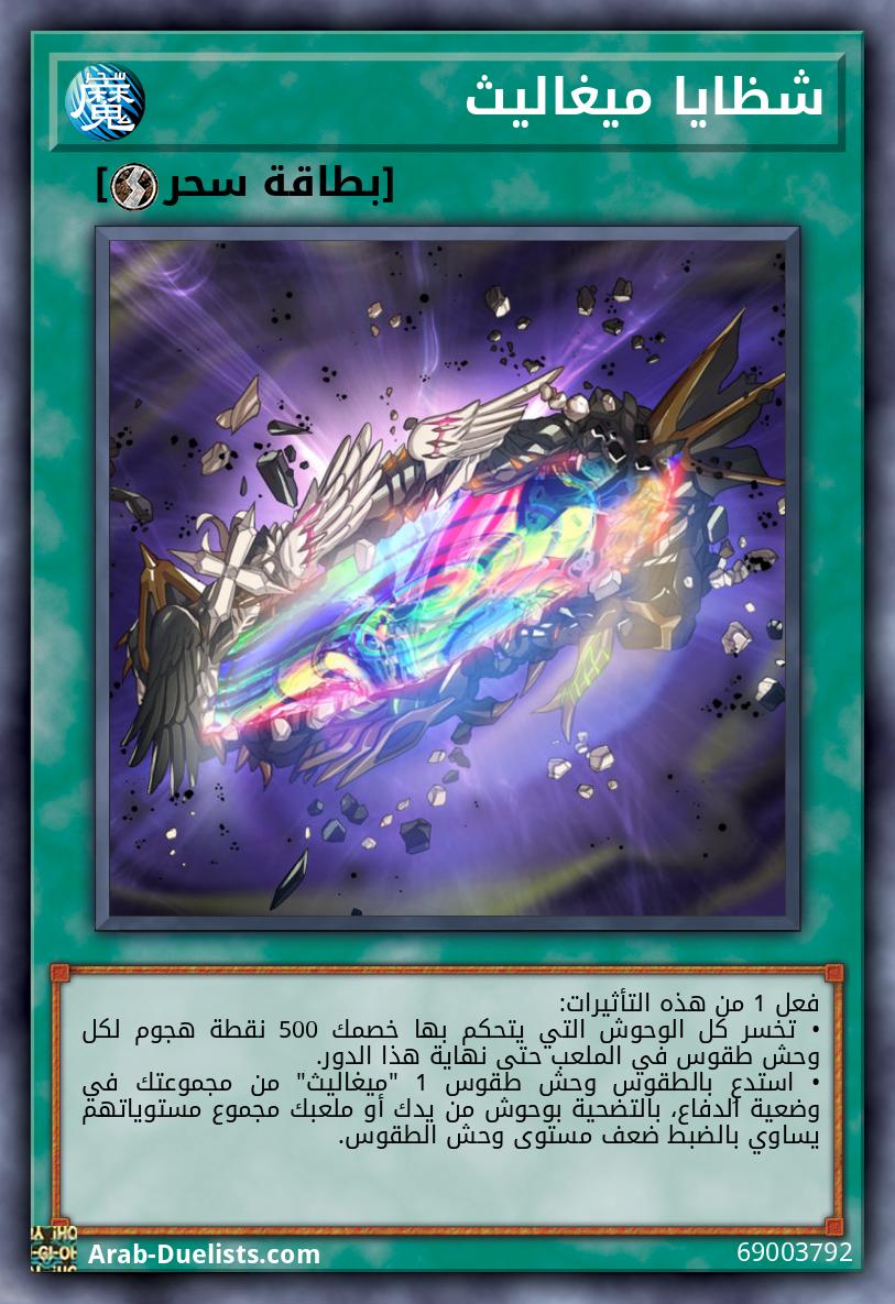 فعل 1 من هذه التأثيرات: • تخسر كل الوحوش التي يتحكم بها خصمك 500 نقطة هجوم لكل وحش طقوس في الملعب حتى نهاية هذا الدور. • استدعِ بالطقوس وحش طقوس 1 "ميغاليث" من مجموعتك في وضعية الدفاع، بالتضحية بوحوش من يدك أو ملعبك مجموع مستوياتهم يساوي بالضبط ضعف مستوى وحش الطقوس.