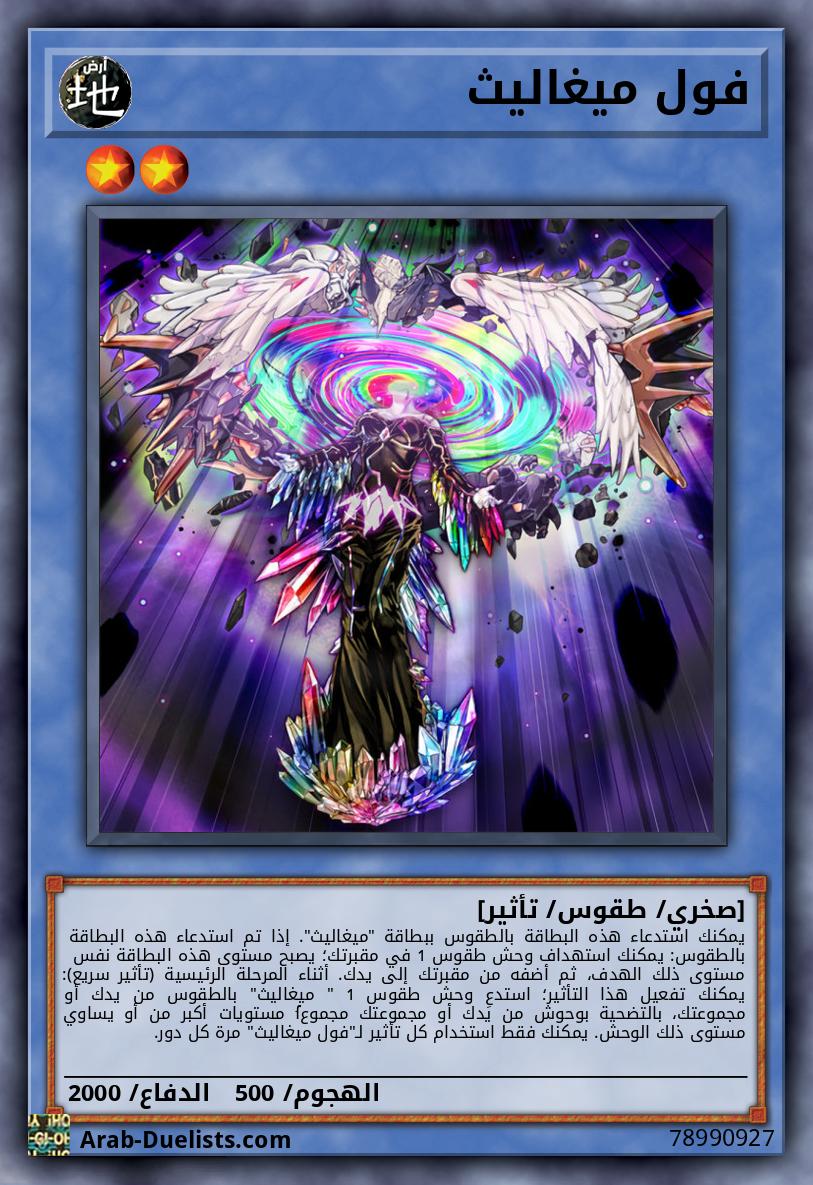 يمكنك استدعاء هذه البطاقة بالطقوس ببطاقة "ميغاليث". إذا تم استدعاء هذه البطاقة بالطقوس: يمكنك استهداف وحش طقوس 1 في مقبرتك؛ يصبح مستوى هذه البطاقة نفس مستوى ذلك الهدف، ثم أضفه من مقبرتك إلى يدك. أثناء المرحلة الرئيسية (تأثير سريع): يمكنك تفعيل هذا التأثير؛ استدعِ وحش طقوس 1 " ميغاليث" بالطقوس من يدك أو مجموعتك، بالتضحية بوحوش من يدك أو مجموعتك fمجموع مستويات أكبر من أو يساوي مستوى ذلك الوحش. يمكنك فقط استخدام كل تأثير لـ"فول ميغاليث" مرة كل دور.