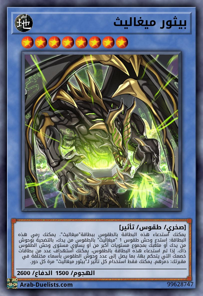 يمكنك استدعاء هذه البطاقة بالطقوس ببطاقة"ميغاليث". يمكنك رمي هذه البطاقة: استدعِ وحش طقوس 1 "ميغاليث" بالطقوس من يدك، بالتضحية بوحوش من يدك أو ملعبك بمجموع مستويات أكبر من أو يساوي مستوى وحش الطقوس ذاك. إذا تم استدعاء هذه البطاقة بالطقوس، يمكنك استهداف عدد من بطاقات خصمك التي يتحكم بها، بما يصل إلى عدد وحوش الطقوس بأسماء مختلفة في مقبرتك: دمرهم. يمكنك فقط استخدام كل تأثير لـ"بيثور ميغاليث" مرة كل دور.