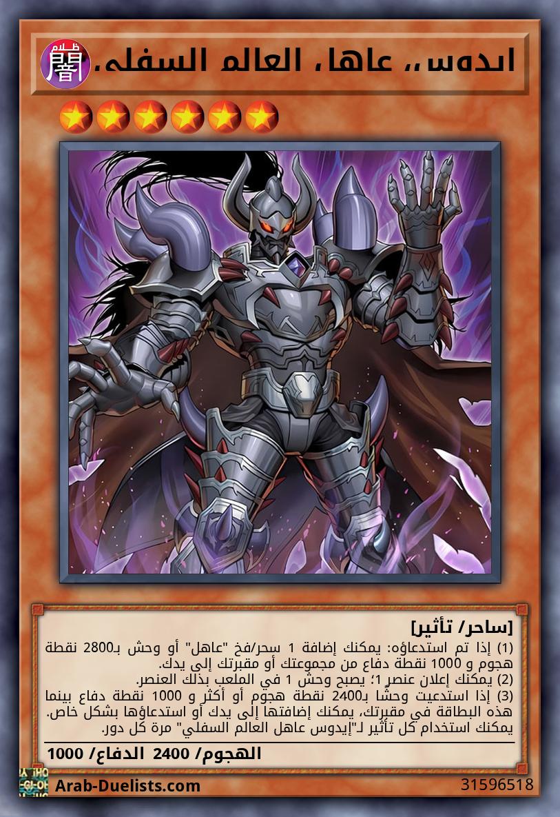 (1) إذا تم استدعاؤه: يمكنك إضافة 1 سحر/فخ "عاهل" أو وحش بـ2800 نقطة هجوم و 1000 نقطة دفاع من مجموعتك أو مقبرتك إلى يدك. (2) يمكنك إعلان عنصر 1؛ يصبح وحش 1 في الملعب بذلك العنصر. (3) إذا استدعيت وحشًا بـ2400 نقطة هجوم أو أكثر و 1000 نقطة دفاع بينما هذه البطاقة في مقبرتك، يمكنك إضافتها إلى يدك أو استدعاؤها بشكل خاص. يمكنك استخدام كل تأثير لـ"إيدوس عاهل العالم السفلي" مرة كل دور.