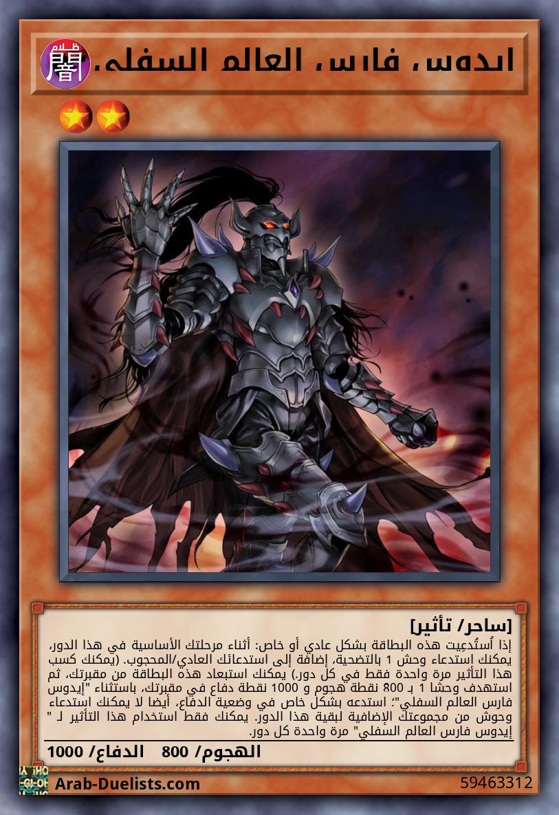 إذا اُستُدعِيت هذه البطاقة بشكل عادي أو خاص: أثناء مرحلتك الأساسية في هذا الدور، يمكنك استدعاء وحش 1 بالتضحية، إضافة إلى استدعائك العادي/المحجوب. (يمكنك كسب هذا التأثير مرة واحدة فقط في كل دور.) يمكنك استبعاد هذه البطاقة من مقبرتك، ثم استهدف وحشا 1 بـ 800 نقطة هجوم و 1000 نقطة دفاع في مقبرتك، باستثناء "إيدوس فارس العالم السفلي"؛ استدعه بشكل خاص في وضعية الدفاع، أيضا لا يمكنك استدعاء وحوش من مجموعتك الإضافية لبقية هذا الدور. يمكنك فقط استخدام هذا التأثير لـ " إيدوس فارس العالم السفلي" مرة واحدة كل دور.