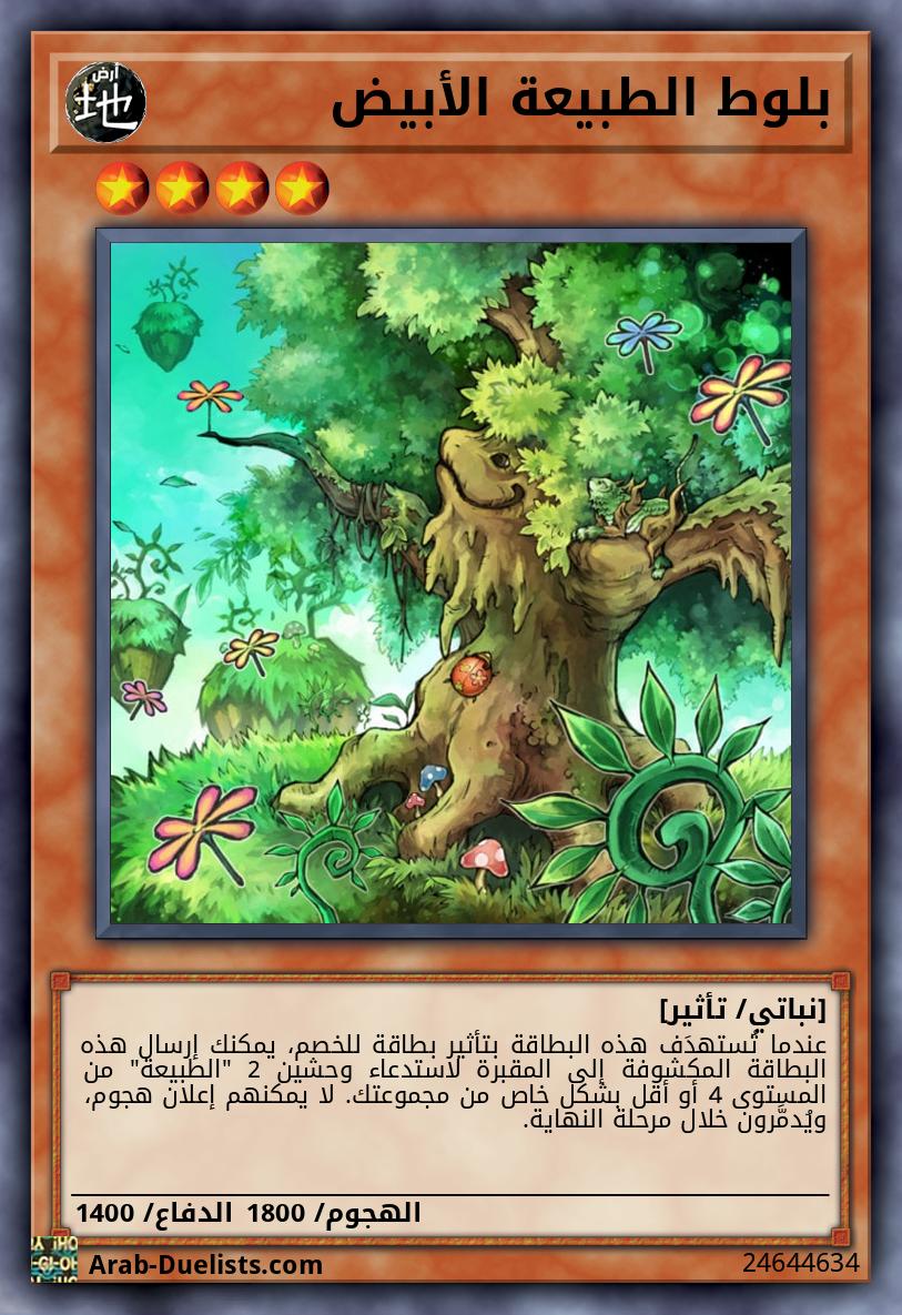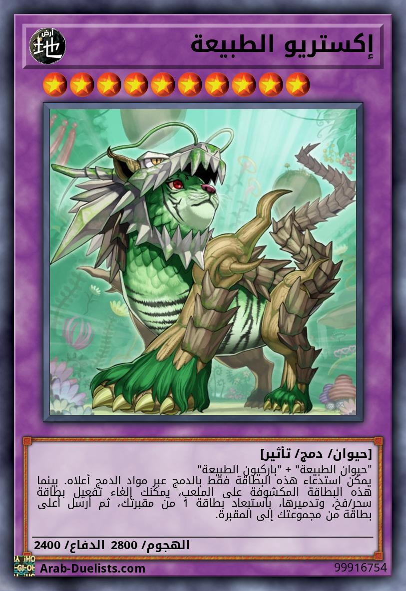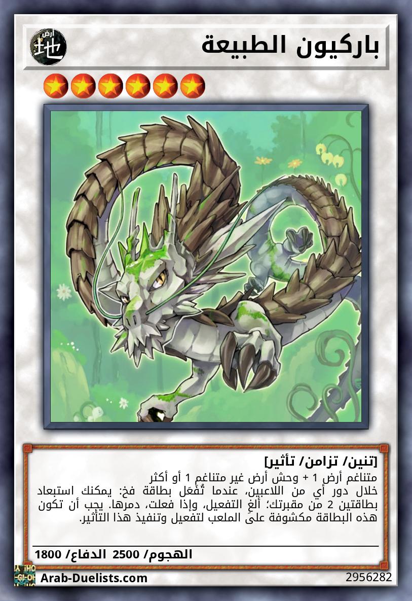 "حيوان الطبيعة" + "باركيون الطبيعة" يمكن استدعاء هذه البطاقة فقط بالدمج عبر مواد الدمج أعلاه. بينما هذه البطاقة المكشوفة على الملعب، يمكنك إلغاء تفعيل بطاقة سحر/فخ، وتدميرها، باستبعاد بطاقة 1 من مقبرتك، ثم أرسل أعلى بطاقة من مجموعتك إلى المقبرة.